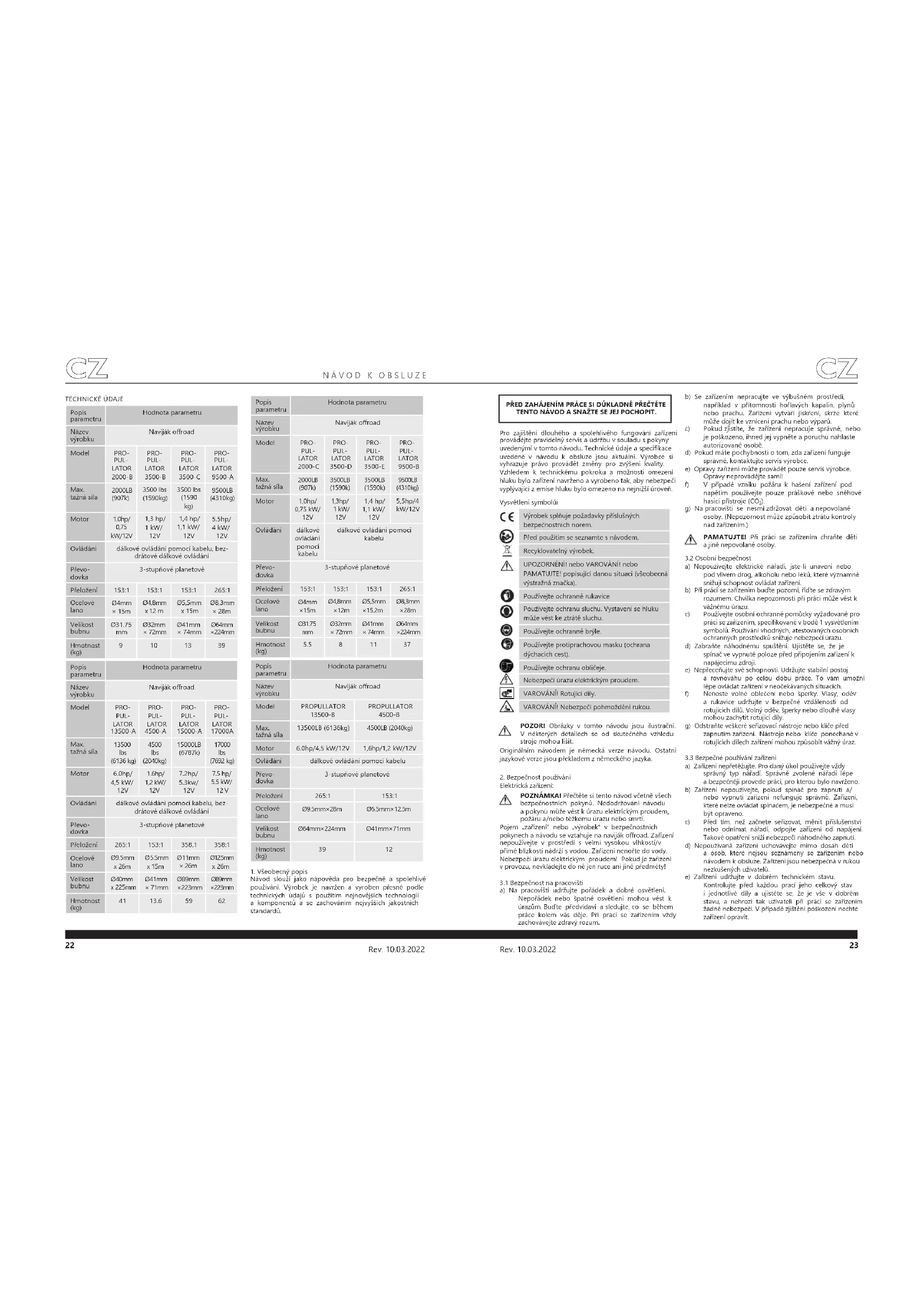 a) Zařízení nepřetěžujte. Pro daný úkol používejte vždy správný typ nářadí. Správně zvolené nářadí lépe a bezpečněji provede práci, pro kterou bylo navrženo. b) Zařízení nepoužívejte, pokud spínač pro zapnutí a/ nebo vypnutí zařízení nefunguje správně. Zařízení, které nelze ovládat spínačem, je nebezpečné a musí být opraveno. c) Před tím, než začnete seřizovat, měnit příslušenství nebo odnímat nářadí, odpojte zařízení od napájení. Takové opatření sníží nebezpečí náhodného zapnutí. d) Nepoužívaná zařízení uchovávejte mimo dosah dětí a osob, které nejsou seznámeny se zařízením nebo návodem k obsluze. Zařízení jsou nebezpečná v rukou nezkušených uživatelů. e) Zařízení udržujte v dobrém technickém stavu. Kontrolujte před každou prací jeho celkový stav i jednotlivé díly a ujistěte se, že je vše v dobrém stavu, a nehrozí tak uživateli při práci se zařízením žádné nebezpečí. V případě zjištění poškození nechte zařízení opravit. Popis parametru Hodnota parametru Název výrobku Naviják oroad Model PRO- PUL- LATOR 2000-B PRO- PUL- LATOR 3500-B PRO- PUL- LATOR 3500-C PRO- PUL- LATOR 9500-A Max. tažná síla 2000LB (907k) 3500 lbs (1590kg) 3500 lbs (1590 kg) 9500LB (4310kg) Motor 1.0hp/ 0,75 kW/12V 1,3 hp/ 1 kW/ 12V 1,4 hp/ 1,1 kW/ 12V 5.5hp/ 4 kW/ 12V Ovládání dálkové ovládání pomocí kabelu, bez- drátové dálkové ovládání Převo- dovka 3-stupňové planetové Přeložení 153:1 153:1 153:1 265:1 Ocelové lano Ø4mm × 15m Ø4,8mm x 12 m Ø5,5mm x 15m Ø8,3mm × 28m Velikost bubnu Ø31.75