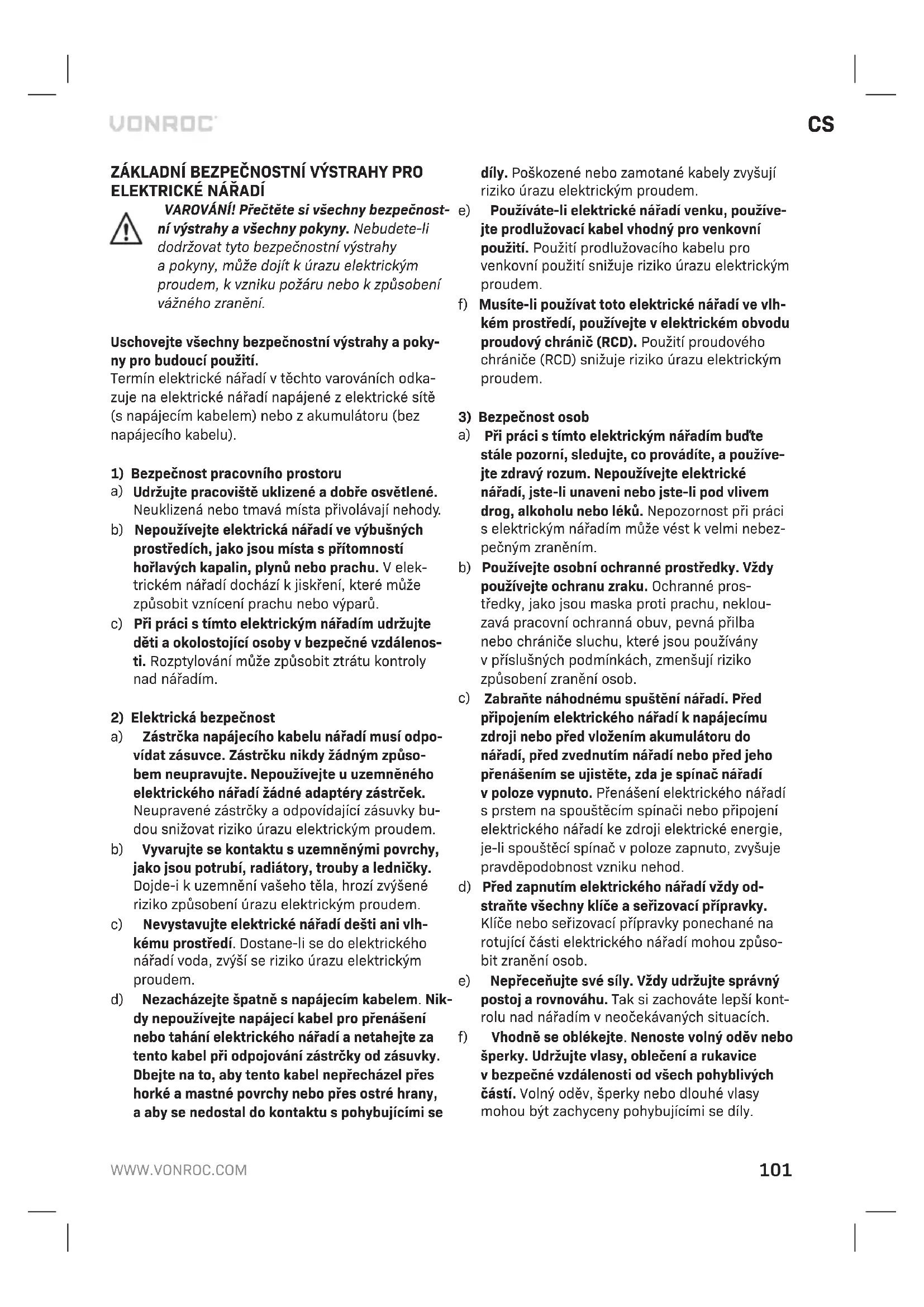 AKUMULÁTORY a) Akumulátor nerozebírejte. Nebezpečí zkratu. b) Chraňte akumulátor před teplem, např. před nepřetržitým intenzivním slunečním světlem, ohněm, vodou avlhkostí. Nebezpečí výbuchu. c) Vpřípadě poškození anesprávného použití akumulátoru se mohou uvolňovat výpary. Vpřípadě potíží vyvětrejte místnost avyhle- dejte lékařskou pomoc. Výpary mohou dráždit dýchací ústrojí. d) Používejte tento akumulátor výhradně svaším výrobkem značky Vonroc. Toto opatření samo osobě chrání akumulátor před nebezpečným přetížením. e) Akumulátor může být poškozen ostrými před- měty, jako například hřebíky nebo šroubováky, nebo vnější silou. Může dojít kvnitřnímu zkratu avznícení, vzniku kouře, výbuchu nebo přehřátí akumulátoru. BEZPEČNOSTNÍ VAROVÁNÍ PRO NABEČKU Použití vsouladu surčením Touto nabečkou nabejte výhradně akumulátorové moduly typu CD801AA aCD803AA. Ostatní typy akumulátorů mohou prasknout azpůsobit zranění apoškození. a) Tento výrobek není určen kpoužití osobami (včetně dětí) se sníženými fyzickými, smys- lovými nebo duševními schopnostmi, nebo snedostatkem zkušeností aznalostí, pokud jim nebyl stanoven dohled nebo pokud jim nebyly poskytnuty potřebné instrukce. b) Děti musí být pod dozorem, aby si stímto zaří- zením nehrály. c) Nenabejte baterie, které nejsou knabení určeny! d) Během nabení musí být akumulátory umístěny na dobře větraném místě! Pokud je přívodní kabel poškozen, musí být vyměněn výrobcem, jeho servisním zástupcem nebo jinou kvalifikovanou osobou, aby nedošlo k ohrožení. Elektrická bezpečnost Vždy zkontrolujte, zda se napájecí napětí sítě shoduje snapájecím napětím na výkonovém štítku.