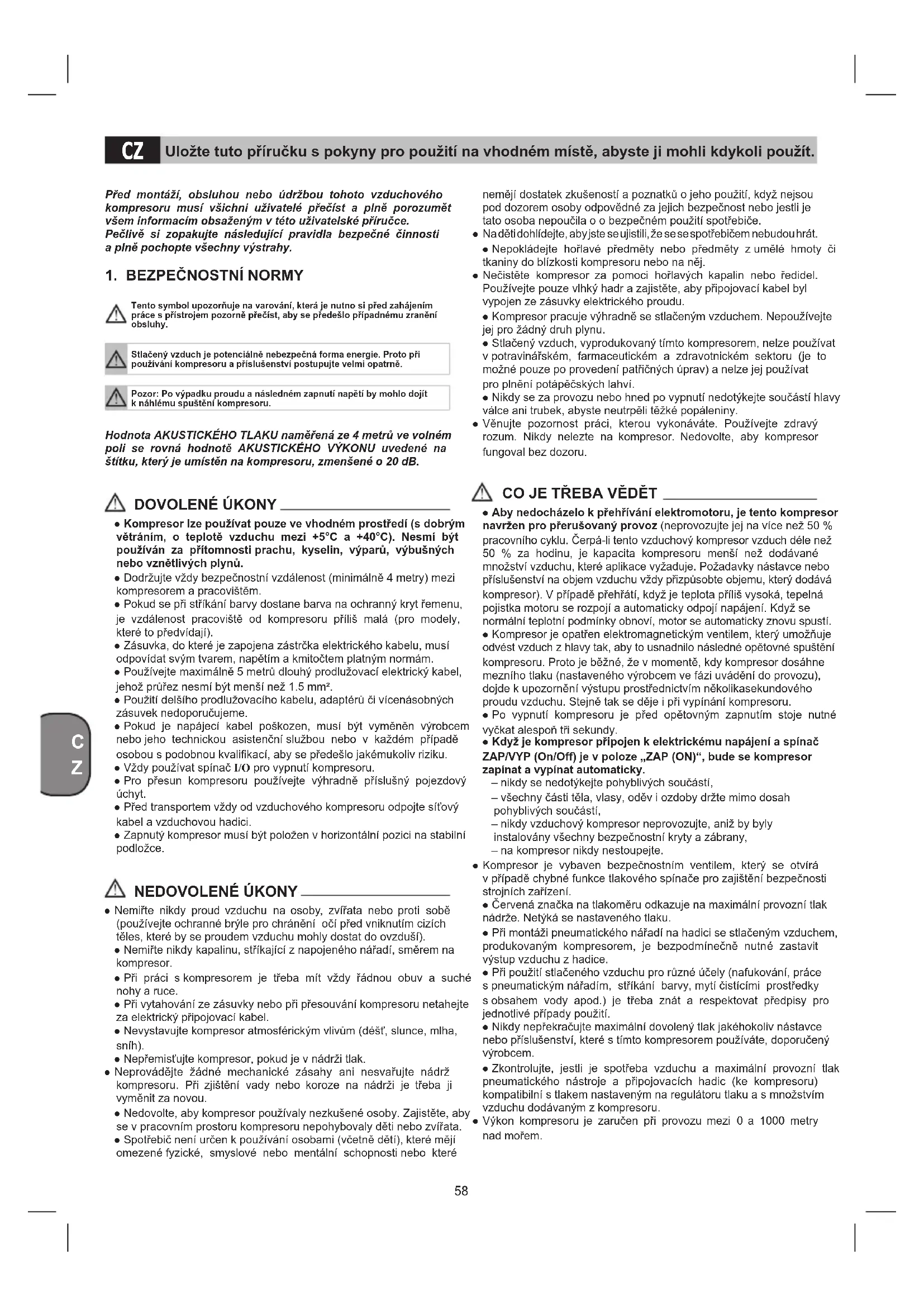 Tento symbol upozorňuje na varování, která je nutno si před zahájením práce s přístrojem pozorně přečíst, aby se předešlo případnému zranění obsluhy.Stlačený vzduch je potenciálně nebezpečná forma energie. Proto při používání kompresoru a příslušenství postupujte velmi opatrně.Pozor: Po výpadku proudu a následném zapnutí napětí by mohlo dojít k náhlému spuštění kompresoru. Hodnota AKUSTICKÉHO TLAKU naměřená ze 4 metrů ve volném poli se rovná hodnotě AKUSTICKÉHO VÝKONU uvedené na štítku, který je umístěn na kompresoru, zmenšené o 20 dB. DOVOLENÉ ÚKONY ● Kompresor lze používat pouze ve vhodném prostředí (s dobrým větráním, o teplotě vzduchu mezi +5°C a +40°C). Nesmí být používán za přítomnosti prachu, kyselin, výparů, výbušných nebo vznětlivých plynů. ● Dodržujte vždy bezpečnostní vzdálenost (minimálně 4 metry) mezi kompresorem a pracovištěm. ● Pokud se při stříkání barvy dostane barva na ochranný kryt řemenu, je vzdálenost pracoviště od kompresoru příliš malá (pro modely, které to předvídají). ● Zásuvka, do které je zapojena zástrčka elektrického kabelu, musí odpovídat svým tvarem, napětím a kmitočtem platným normám. ● Používejte maximálně 5 metrů dlouhý prodlužovací elektrický kabel, jehož průřez nesmí být menší než 1.5 mm². ● Použití delšího prodlužovacího kabelu, adaptérů či vícenásobných zásuvek nedoporučujeme. ● Pokud je napájecí kabel poškozen, musí být vyměněn výrobcem nebo jeho technickou asistenční službou nebo v každém případě osobou s podobnou kvalikací, aby se předešlo jakémukoliv riziku. ● Vždy používat spínač I/O pro vypnutí kompresoru. ● Pro přesun kompresoru používejte výhradně příslušný pojezdový úchyt. ● Před transportem vždy od vzduchového kompresoru odpojte síťový kabel a vzduchovou hadici. ● Zapnutý kompresor musí být položen v horizontální pozici na stabilní podložce. NEDOVOLENÉ ÚKONY ● Nemiřte nikdy proud vzduchu na osoby, zvířata nebo proti sobě (používejte ochranné brýle pro chránění očí před vniknutím cizích těles, které by se proudem vzduchu mohly dostat do ovzduší). ● Nemiřte nikdy kapalinu, stříkající z napojeného nářadí, směrem na kompresor. ● Při práci s kompresorem je třeba mít vždy řádnou obuv a suché nohy a ruce. ● Při vytahování ze zásuvky nebo při přesouvání kompresoru netahejte za elektrický připojovací kabel. ● Nevystavujte kompresor atmosférickým vlivům (déšť, slunce, mlha, sníh). ● Nepřemisťujte kompresor, pokud je v nádrži tlak. ● Neprovádějte žádné mechanické zásahy ani nesvařujte nádrž kompresoru. Při zjištění vady nebo koroze na nádrži je třeba ji vyměnit za novou. ● Nedovolte, aby kompresor používaly nezkušené osoby. Zajistěte, aby se v pracovním prostoru kompresoru nepohybovaly děti nebo zvířata. ● Spotřebič není určen k používání osobami (včetně dětí), které mějí omezené fyzické, smyslové nebo mentální schopnosti nebo které nemějí dostatek zkušeností a poznatků o jeho použití, když nejsou pod dozorem osoby odpovědné za jejich bezpečnost nebo jestli je tato osoba nepoučila o o bezpečném použití spotřebiče. ● Na děti dohlídejte, aby jste se ujistili, že se se spotřebičem nebudou hrát. ● Nepokládejte hořlavé předměty nebo předměty z umělé hmoty či tkaniny do blízkosti kompresoru nebo na něj. ● Nečistěte kompresor za pomoci hořlavých kapalin nebo ředidel. Používejte pouze vlhký hadr a zajistěte, aby připojovací kabel byl vypojen ze zásuvky elektrického proudu. ● Kompresor pracuje výhradně se stlačeným vzduchem. Nepoužívejte jej pro žádný druh plynu. ● Stlačený vzduch, vyprodukovaný tímto kompresorem, nelze používat v potravinářském, farmaceutickém a zdravotnickém sektoru (je to možné pouze po provedení patřičných úprav) a nelze jej používat pro plnění potápěčských lahví. ● Nikdy se za provozu nebo hned po vypnutí nedotýkejte součástí hlavy válce ani trubek, abyste neutrpěli těžké popáleniny. ● Věnujte pozornost práci, kterou vykonáváte. Používejte zdravý rozum. Nikdy nelezte na kompresor. Nedovolte, aby kompresor fungoval bez dozoru. CO JE TŘEBA VĚDĚT ● Aby nedocházelo k přehřívání elektromotoru, je tento kompresor navržen pro přerušovaný provoz (neprovozujte jej na více než 50 % pracovního cyklu. Čerpá-li tento vzduchový kompresor vzduch déle než 50 % za hodinu, je kapacita kompresoru menší než dodávané množství vzduchu, které aplikace vyžaduje. Požadavky nástavce nebo příslušenství na objem vzduchu vždy přizpůsobte objemu, který dodává kompresor). V případě přehřátí, když je teplota příliš vysoká, tepelná pojistka motoru se rozpojí a automaticky odpojí napájení. Když se normální teplotní podmínky obnoví, motor se automaticky znovu spustí. ● Kompresor je opatřen elektromagnetickým ventilem, který umožňuje odvést vzduch z hlavy tak, aby to usnadnilo následné opětovné spuštění kompresoru. Proto je běžné, že v momentě, kdy kompresor dosáhne mezního tlaku (nastaveného výrobcem ve fázi uvádění do provozu), dojde k upozornění výstupu prostřednictvím několikasekundového proudu vzduchu. Stejně tak se děje i při vypínání kompresoru. ● Po vypnutí kompresoru je před opětovným zapnutím stoje nutné vyčkat alespoň tři sekundy. ● Když je kompresor připojen k elektrickému napájení a spínač ZAP/VYP (On/Off) je v poloze „ZAP (ON)“, bude se kompresor zapínat a vypínat automaticky. – nikdy se nedotýkejte pohyblivých součástí, – všechny části těla, vlasy, oděv i ozdoby držte mimo dosah pohyblivých součástí, – nikdy vzduchový kompresor 