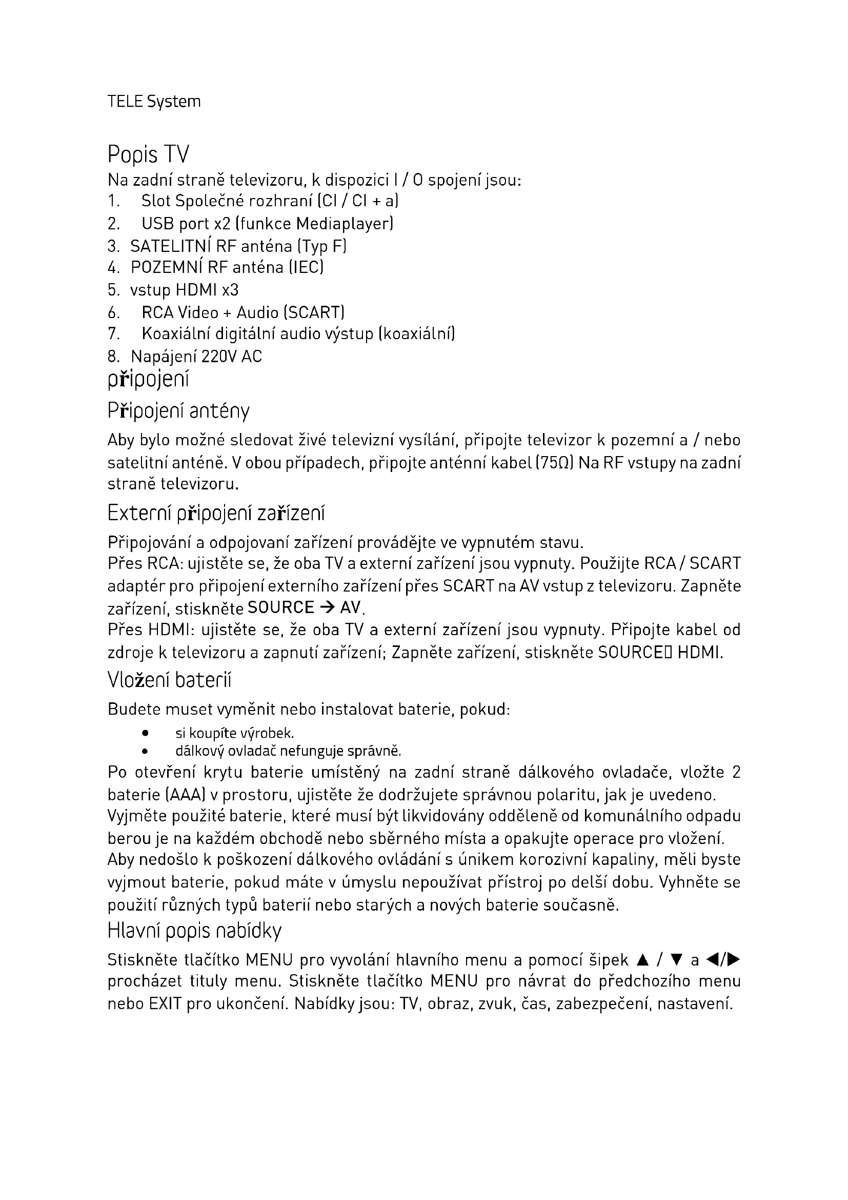 - dálkový ovladač nefunguje správně. Po otevření krytu baterie umístěný na zadní straně dálkového ovladače, vložte 2 baterie (AAA) v prostoru, ujistěte že dodržujete správnou polaritu, jak je uvedeno. Vyjměte použité baterie, které musí být likvidovány odděleně od komunálního odpadu berou je na každém obchodě nebo sběrného místa a opakujte operace pro vložení. Aby nedošlo k poškození dálkového ovládání s únikem korozivní kapaliny, měli byste vyjmout baterie, pokud máte v úmyslu nepoužívat přístroj po delší dobu. Vyhněte se použití různých typů baterií nebo starých a nových baterie současně. Hlavní popis nabídky Stiskněte tlačítko MENU pro vyvolání hlavního menu a pomocí šipek ▲ / ▼ a t/u procházet tituly menu. Stiskněte tlačítko MENU pro návrat do předchozího menu nebo EXIT pro ukončení. Nabídky jsou: TV, obraz, zvuk, čas, zabezpečení, nastavení.CESKY První instalace Při první instalaci zvolte požadovaný jazyk OSD a zemi, po zadání PIN (4 číslice- 0000) a potvrďte ji pokračovat. Vyberte typ signálu (DVB-T2, nebo satelit) a spusťte vyhledávání kanálů - stiskněte tlačítko OK. Automatické vyhledávání kanálů Stisknutím tlačítka MENU à Kanál à Auto Tuning a potvrďte tlačítkem OK. Vyberte zemi (výchozí Itálie) a stiskněte tlačítko OK pro spuštění skenování. Kdykoli stisknutím tlačítka EXIT nebo Menu, skenování lze zastavite VAROVÁNÍ! Automatické vyhledávání kanálů vymaže všechny seznamy kanálů dříve uložené. režim DVB-C (přes kabel) je k dispozici pro příjem digitálních kanálů, zvolte DVB-C a stiskněte tlačítko OK pro spuštění skenování. VAROVÁNÍ! Ujistěte se, že nevyberete tento režim v případě, že tradiční pozemní antény. VAROVÁNÍ! Příjem a tedy i zobrazování digitálních pozemních kanálů závisí na úrovni a kvalitĚ anténního signálu k dispozici signál liší v závislosti na oblasti, ve které žijete, správné orientace / fungování anténního systému a ke kvalitě z signálU přenášenÉHO prostřednictvím pozemních digitálních opakovačů Úprava seznamu kanálů Stisknutím tlačítka MENUà Kanál à editovat programa potvrďte tlačítkem OK. Jakmile se zobrazí seznam, možnosti jsou: ČERVENÉ (Delete-smazat): vyberte jeden nebo více kanálů, mazat stiskem červeného tlačítka. Modrý (Skip-přeskočit): vyberte kanál a stiskněte tlačítko BLUE-Modré, jakmile je aktivován kanál lze zvolit pomocí číselných tlačítek na dálkovém ovladači. Žluté (Move- přesun): přesunout kanál, vyberte kanál, který chcete přesunout, stiskněte tlačítko Žluté, pomocí šipek přesuňte kanál na požadovanou pozici nebo zadat požadované číslo pozice a stiskněte tlačítko OK pro potvrzení. Režim Satelit Zvolíte-li satelit, můžete si vybrat pro načtení výchozí seznam satelitních kanálů stiskem tlačítka OK a potvrzením Ano (šipku vlevo) na žádost o potvrzení; nebo pokračovat v běžných zařízeních, jakmile budou družicové parametry nastaveny, Typ skenování, typ kanálu a typ služby, stisknutím tlačítka OK a volbou No (šipka vpravo), na další obrazovce. Chcete-li aktivovat režim digitálního příjmu kanálu, stiskněte Zdroj à Satelit. Můžete prohledávat frekvence které jsou k dispozici u Vašeho anténního systému, automaticky vyhledávat pro všechny satelitní kanály od první instalace nebo prostřednictvím automatického skenování k dispozici v nabídce Kanály. Nastavení sat antény základní nastavení umožňují použití televizoru s jedinou univerzálním LNB (Low Noise Block konvertor) systému (běžně používané pro satelitní systémy); V případě, váš systém je provedeno s jinou konfigurací, je nutné odpovídajícím způsobem změnit nastavení antény.TELE System VAROVÁNÍ! Špatná konfigurace antény může mít za následek selhání zavést některé nebo všechny kanály. Pokud nechcete znát charakteristiky vašeho anténního systému a / nebo nejsou schopny správně nakonfigurovat přijímač sami, můžete chtít konzultovat profesionální instalátor pro radu. Indikátory napájení a kvalita signálu se vztahují k prvnímu transpondéru vybraného satelitní seznamu Obnovit tovární nastavení Tato funkce umožňuje obnovení do továrního nastavení. Chcete-li tak učinit, zvolte Obnovit nastavení ... a na nové obrazovce, vyberte YES-ANO. Televizor se vrátí do továrního nastavení. VAROVÁNÍ! Obnovení továrního nastavení se spustí průvodce instalací (viz kapitola „První instalace“), a také vymaže všechny dříve uložený ch kanálů a nastavení nastavené uživatelem. Technické specifikace parametry Zobrazit Úhlopříčka 31,5” (80 cm) 16: 9 Wide Rozlišení 1366 (H) x 768 (V) - HD READY Kontrastní poměr 3000:1 Jas 200 (cd / m2) Úhel pohledu 178°/178° (H/V) Vstupy /výstupy
