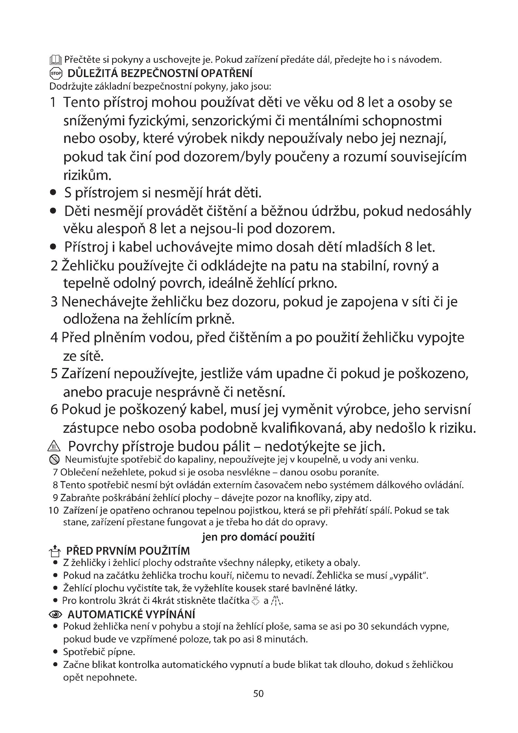 ЗАЩИТА ОКРУЖАЮЩЕЙ СРЕДЫ Для того чтобы избежать угроз для здоровья и окружающей среды из-за вредных веществ в электрических и электронных товарах, приборы, отмеченные данным символом, должны утилизироваться не как не отсортированные бытовые отходы, а как восстановленные или повторно использованные.50 3 Přečtěte si pokyny a uschovejte je. Pokud zařízení předáte dál, předejte ho i s návodem. A DŮLEŽITÁ BEZPEČNOSTNÍ OPATŘENÍ Dodržujte základní bezpečnostní pokyny, jako jsou: 1 Tento přístroj mohou používat děti ve věku od 8 let a osoby se sníženými fyzickými, senzorickými či mentálními schopnostmi nebo osoby, které výrobek nikdy nepoužívaly nebo jej neznají, pokud tak činí pod dozorem/byly poučeny a rozumí souvisejícím rizikům.