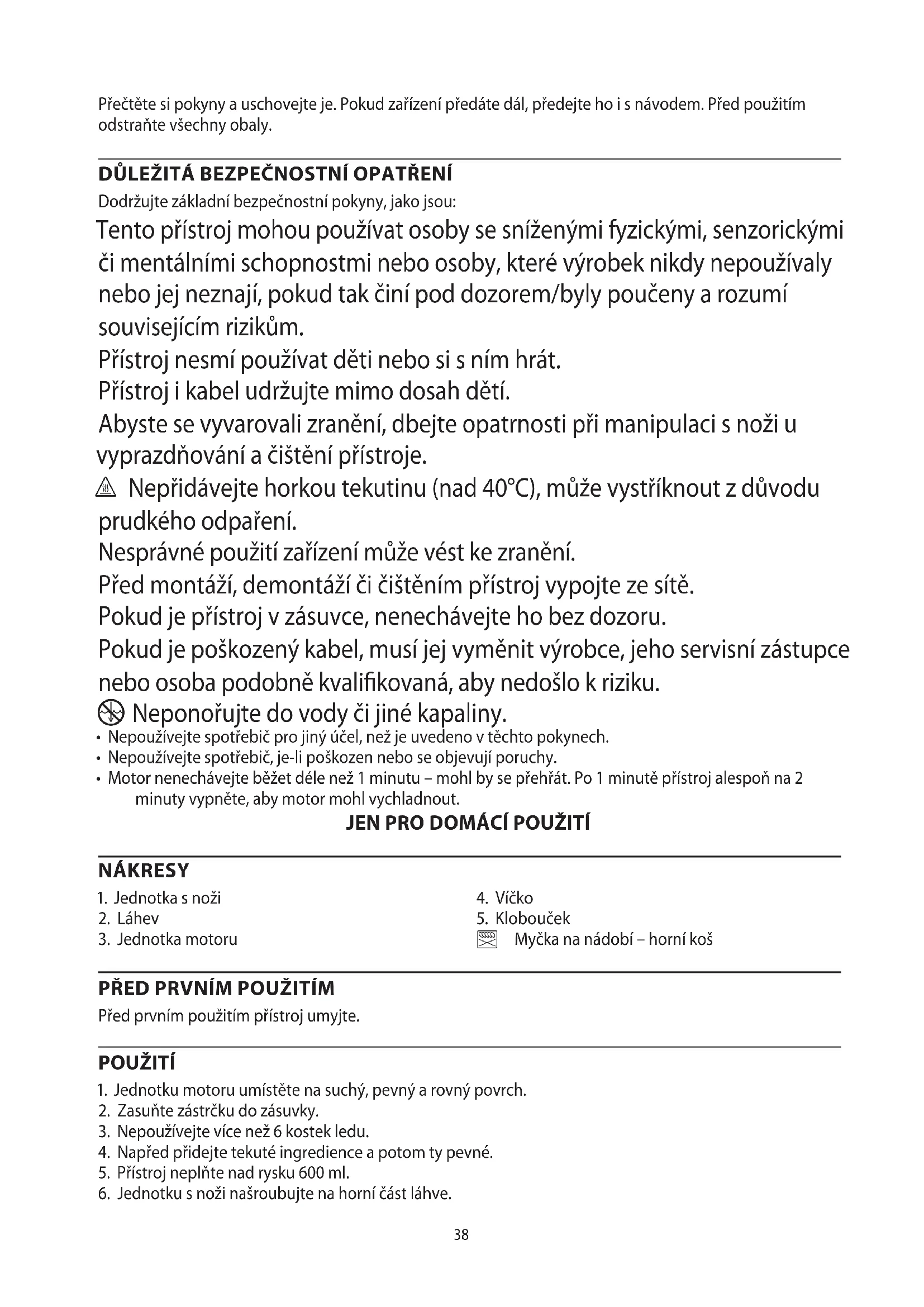 AE38 Přečtěte si pokyny a uschovejte je. Pokud zařízení předáte dál, předejte ho i s návodem. Před použitím odstraňte všechny obaly. DŮLEŽITÁ BEZPEČNOSTNÍ OPATŘENÍ Dodržujte základní bezpečnostní pokyny, jako jsou: Tento přístroj mohou používat osoby se sníženými fyzickými, senzorickými či mentálními schopnostmi nebo osoby, které výrobek nikdy nepoužívaly nebo jej neznají, pokud tak činí pod dozorem/byly poučeny a rozumí souvisejícím rizikům. Přístroj nesmí používat děti nebo si s ním hrát. Přístroj i kabel udržujte mimo dosah dětí. Abyste se vyvarovali zranění, dbejte opatrnosti při manipulaci s noži u vyprazdňování a čištění přístroje. h Nepřidávejte horkou tekutinu (nad 40°C), může vystříknout z důvodu prudkého odpaření. Nesprávné použití zařízení může vést ke zranění. Před montáží, demontáží či čištěním přístroj vypojte ze sítě. Pokud je přístroj v zásuvce, nenechávejte ho bez dozoru. Pokud je poškozený kabel, musí jej vyměnit výrobce, jeho servisní zástupce nebo osoba podobně kvalifikovaná, aby nedošlo k riziku.