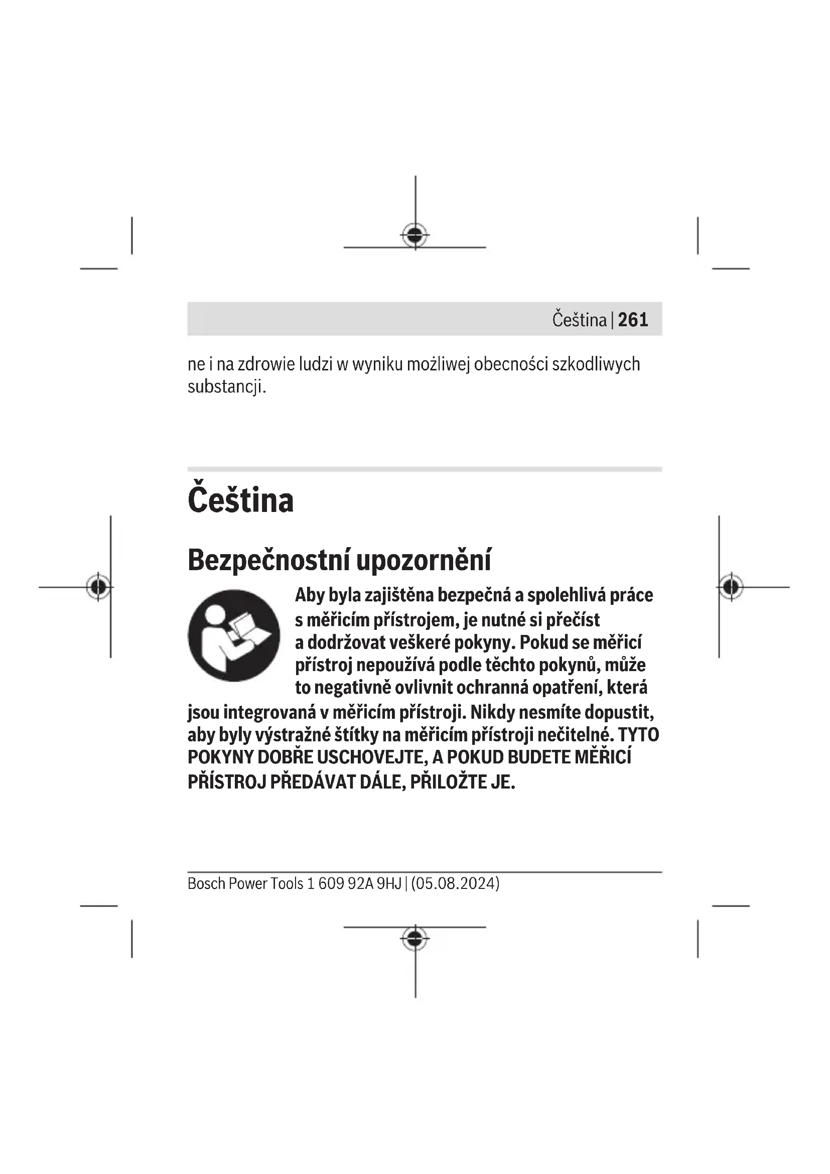 při 20–25°C D) Uvedené hodnoty platí za předpokladu normálních až příznivých podmínek prostředí (např. bez vibrací, bez mlhy, bez kouře, bez přímého slunečního záření). Po velkém kolísání teploty může dojít kodchylkám přesnosti. E) Vyskytuje se pouze nevodivé znečištění, přičemž příležitostně se ale očekává dočasná vodivost způsobená orosením. F) Hmotnost s nástěnným držákem a bez baterií/akumulátorů Kjednoznačné identifikaci měřicího přístroje slouží sériové číslo (11) na typovém štítku. 1 609 92A 9HJ | (05.08.2024) Bosch Power ToolsČeština | 269 Napájení měřicího přístroje Nasazení/výměna baterií Pro provoz měřicího přístroje doporučujeme použít alkalicko- manganové baterie nebo akumulátory. Pro otevření krytu přihrádky pro baterie(8) stiskněte aretaci(7) akryt přihrádky pro baterie sejměte. Vložte baterie, resp. akumulátory. Přitom dodržujte správnou polaritu podle vyobrazení na vnitřní straně přihrádky baterie. Vyměňte vždy všechny baterie, resp. akumulátory současně. Použijte pouze baterie nebo akumulátory jednoho výrobce astejné kapacity. u Když měřicí přístroj delší dobu nepoužíváte, vyjměte zněj baterie, resp. akumulátory. Baterie aakumulátory mohou při delším skladování vměřicím přístroji zkorodovat. Bosch Power Tools 1 609 92A 9HJ | (05.08.2024)270 | Čeština Provoz Uvedení do provozu u Chraňte měřicí přístroj před vlhkem apřímým slunečním zářením. u Nevystavujte měřicí přístroj extrémním teplotám nebo kolísání teplot. Nenechávejte ho např. delší dobu ležet vautě. Při větším kolísání teplot nechte měřicí přístroj nejprve vytemperovat, než ho uvedete do provozu. Při extrémních teplotách nebo teplotních výkyvech může být omezena přesnost přístroje. u Chraňte měřicí přístroj před prudkými nárazy nebo pádem. Poškození měřicího přístroje může negativně ovlivnit přesnost. Po prudkém nárazu nebo pádu porovnejte laserovou čáru pro kontrolu se známou vodorovnou nebo svislou referenční linií. u Pro označení používejte vždy pouze střed laserového bodu, resp. laserové čáry. Velikost laserového bodu resp. šířka laserové přímky se mění se vzdáleností. 1 609 92A 9HJ | (05.08.2024) Bosch Power ToolsČeština | 271 Zapnutí avypnutí Pro zapnutí měřicího přístroje vbodovém provozu posuňte vypínač(2) ostupeň ve směru kvýstupním otvorům laseru (poloha vypínače●). Pro zapnutí včárovém provozu posuňte vypínač(2) až nadoraz ve směru kvýstupním otvorům laseru (poloha vypínače—). Měřicí přístroj vysílá ihned po zapnutí podle zvoleného druhu provozu laserový paprsek zvýstupního otvoru(6) (bodový provoz) nebo (1) (čárový provoz). u Nemiřte laserový paprsek na osoby nebo zvířata anedívejte se sami do něj, ato ani zvětší vzdálenosti. Pro vypnutí měřicího přístroje posuňte vypínač (2) až nadoraz ve směru OFF. u Nenechávejte zapnutý měřicí přístroj bez dozoru apo použití ho vypněte. Mohlo by dojít koslnění jiných osob laserovým paprskem. Bosch Power Tools 1 609 92A 9HJ | (05.08.2024)272 | Čeština Nastavení polohy měřicího přístroje (vizobrázekA) Udané přesnosti nivelace lze dosáhnout tehdy, pokud bude měřicí přístroj ve správné poloze: – Při vodorovném vyrovnání pomocí libely pro vodorovné vyrovnání(4) musí hliníková přikládací plocha(12) měřicího přístroje směřovat dolů. – Při svislém vyrovnání pomocí libely pro svislé vyrovnání(5) musí výstupní otvory laseru(6) a(1) směřovat nahoru ahliníková přikládací plocha(12) měřicího přístroje doleva. Možnosti použití Vyrovnání pomocí laserové čáry (čárový provoz) Včárovém provozu můžete např. vyrovnávat předměty na stěnách: – Vodorovně vedle sebe (měřicí přístroj je umístěný vodorovně), – Svisle nad sebou (měřicí přístroj je umístěný svisle), – Vlibovolném úhlu (měřicí přístroj je vyrovnaný pomocí otočného kotouče(14) držáku). Nasaďte měřicí přístroj magnetem(9) přímo na svislou magnetickou plochu nebo použijte držák(13). 1 609 92A 9HJ | (05.08.2024) Bosch Power ToolsČeština | 273 Pro upevnění držáku(13) na stěnu existují 2možnosti: – Upevnění pomocí hřebíčků (viz obrázekB): Nasaďte držák(13) na stěnu. Zarazte dodané hřebíčky(18) skrze otvory vdržáku do stěny (podle vlastností stěny kolmo nebo vúhlu45°). – Zavěšení: Nasaďte držák(13) otvorem na zadní straně na šroub nebo hřebík, který mírně vyčnívá ze stěny. Zadní strana držáku musí doléhat ke stěně. Dbejte na bezpečné upevnění držáku(13) na stěně. Nasaďte měřicí přístroj magnetem(9) na magnetické uchycení(15) držáku. Upozornění: Vodorovné vyrovnání pomocí laserové čáry je možné pouze na stěně, na které je měřicí přístroj upevněný. Ikdyž je vidět laserová čára na přilehlých stěnách, nemusí na těchto stěnách nutně vést vodorovně. Vyrovnání vlibovolných úhlech (viz obrázekC): Vodorovně vyrovnejte měřicí přístroj na držáku. Poté otočte otočný kotouč(14) držáku tak, aby značka0° byla pod ukazatelem polohy(3) měřicího přístroje. Nyní otočte měřicí přístroj tak, aby ukazatel polohy(3) ukazoval na požadovaný úhel na otočném kotouči. Bosch Power Tools 1 609 92A 9HJ | (05.08.2024)274 | Čeština Přenášení/kontrola výšek pomocí laserového bodu (bodový provoz) (vizobrázekD) Nasaďte držák(13) 1/4" stativovým závitem(17) na závit stativu(16) nebo běžného fotografického stativu. Přišroubujte držák pomocí zajišťovacího šroubu stativu. Vodorovně vyrovnejte hlavu stativu. Nasaďte měřicí přístroj magnetem(9) na magnetické uchycení(15) držáku avodorovně h