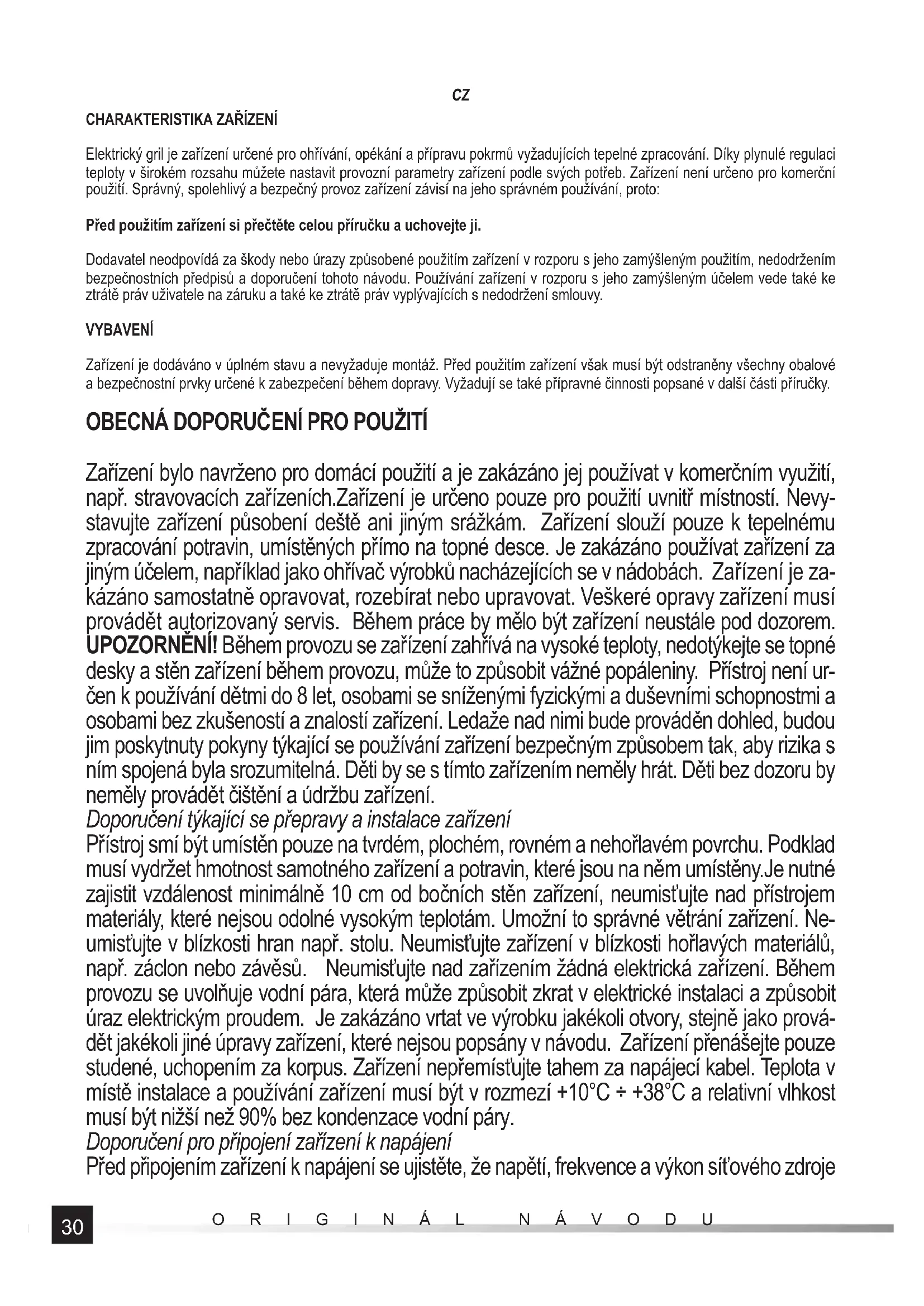 Zařízení bylo navrženo pro domácí použití a je zakázáno jej používat v komerčním využití, např. stravovacích zařízeních.Zařízení je určeno pouze pro použití uvnitř místností. Nevy- stavujte zařízení působení deště ani jiným srážkám. Zařízení slouží pouze k tepelnému zpracování potravin, umístěných přímo na topné desce. Je zakázáno používat zařízení za jiným účelem, například jako ohřívač výrobků nacházejících se v nádobách. Zařízení je za- kázáno samostatně opravovat, rozebírat nebo upravovat. Veškeré opravy zařízení musí provádět autorizovaný servis. Během práce by mělo být zařízení neustále pod dozorem. UPOZORNĚNÍ! Během provozu se zařízení zahřívá na vysoké teploty, nedotýkejte se topné desky a stěn zařízení během provozu, může to způsobit vážné popáleniny. Přístroj není ur- čen k používání dětmi do 8 let, osobami se sníženými fyzickými a duševními schopnostmi a osobami bez zkušeností a znalostí zařízení. Ledaže nad nimi bude prováděn dohled, budou jim poskytnuty pokyny týkající se používání zařízení bezpečným způsobem tak, aby rizika s ním spojená byla srozumitelná. Děti by se s tímto zařízením neměly hrát. Děti bez dozoru by neměly provádět čištění a údržbu zařízení. Doporučení týkající se přepravy a instalace zařízení Přístroj smí být umístěn pouze na tvrdém, plochém, rovném a nehořlavém povrchu. Podklad musí vydržet hmotnost samotného zařízení a potravin, které jsou na něm umístěny.Je nutné zajistit vzdálenost minimálně 10 cm od bočních stěn zařízení, neumisťujte nad přístrojem materiály, které nejsou odolné vysokým teplotám. Umožní to správné větrání zařízení. Ne- umisťujte v blízkosti hran např. stolu. Neumisťujte zařízení v blízkosti hořlavých materiálů, např. záclon nebo závěsů. Neumisťujte nad zařízením žádná elektrická zařízení. Během provozu se uvolňuje vodní pára, která může způsobit zkrat v elektrické instalaci a způsobit úraz elektrickým proudem. Je zakázáno vrtat ve výrobku jakékoli otvory, stejně jako prová- dět jakékoli jiné úpravy zařízení, které nejsou popsány v návodu. Zařízení přenášejte pouze studené, uchopením za korpus. Zařízení nepřemísťujte tahem za napájecí kabel. Teplota v místě instalace a používání zařízení musí být v rozmezí +10°C ÷ +38°C a relativní vlhkost musí být nižší než 90% bez kondenzace vodní páry. Doporučení pro připojení zařízení k napájení Před připojením zařízení k napájení se ujistěte, že napětí, frekvence a výkon síťového zdroje31