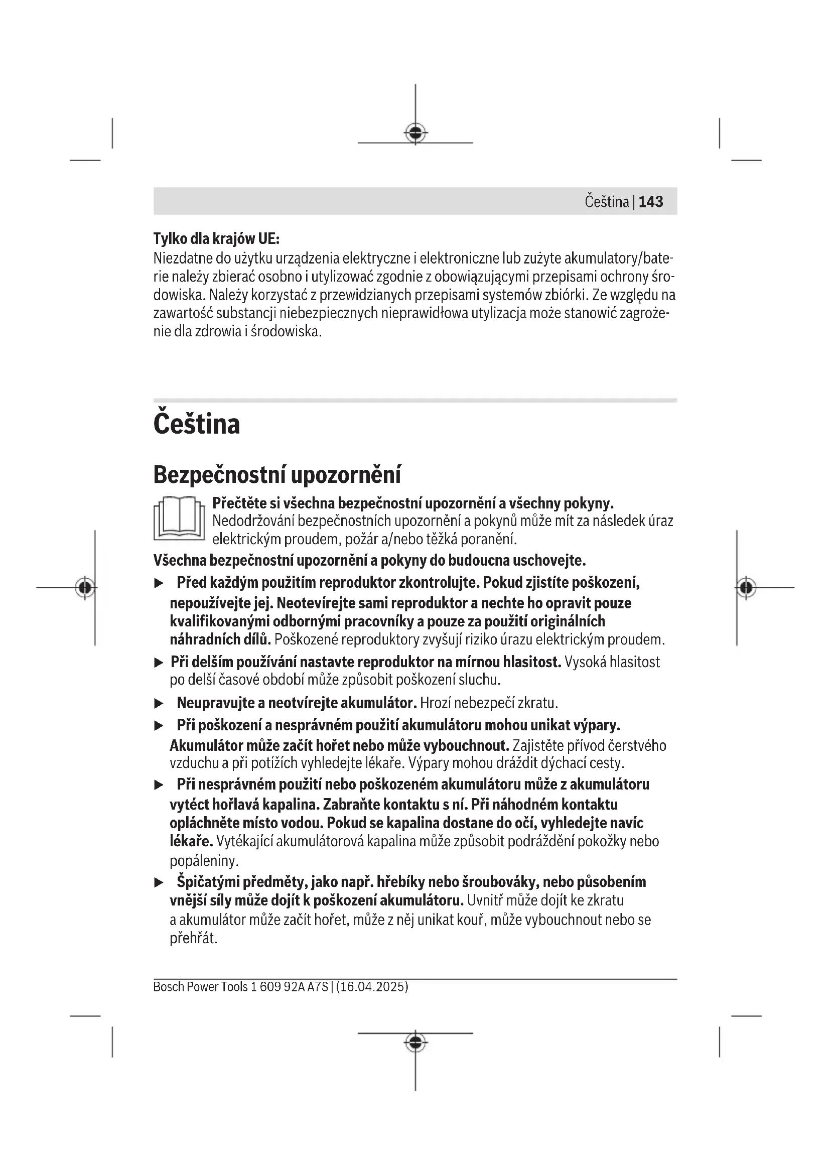 IP54 Doporučená teplota prostředí při nabíjení °C 0až+35 Dovolená teplota prostředí při provozu °C –20až+40 Dovolená teplota prostředí při skladování °C −20až+50 Doporučené akumulátory (2,0−12,0Ah) GBA18V… ProCORE18V… EXPERT18V… EXBA18V… CORE18V… Doporučené nabíječky GAL18V… GAL36V… GAL12V/18… Bosch Power Tools 1 609 92A A7S | (16.04.2025)146 | Čeština Reproduktor Bluetooth®