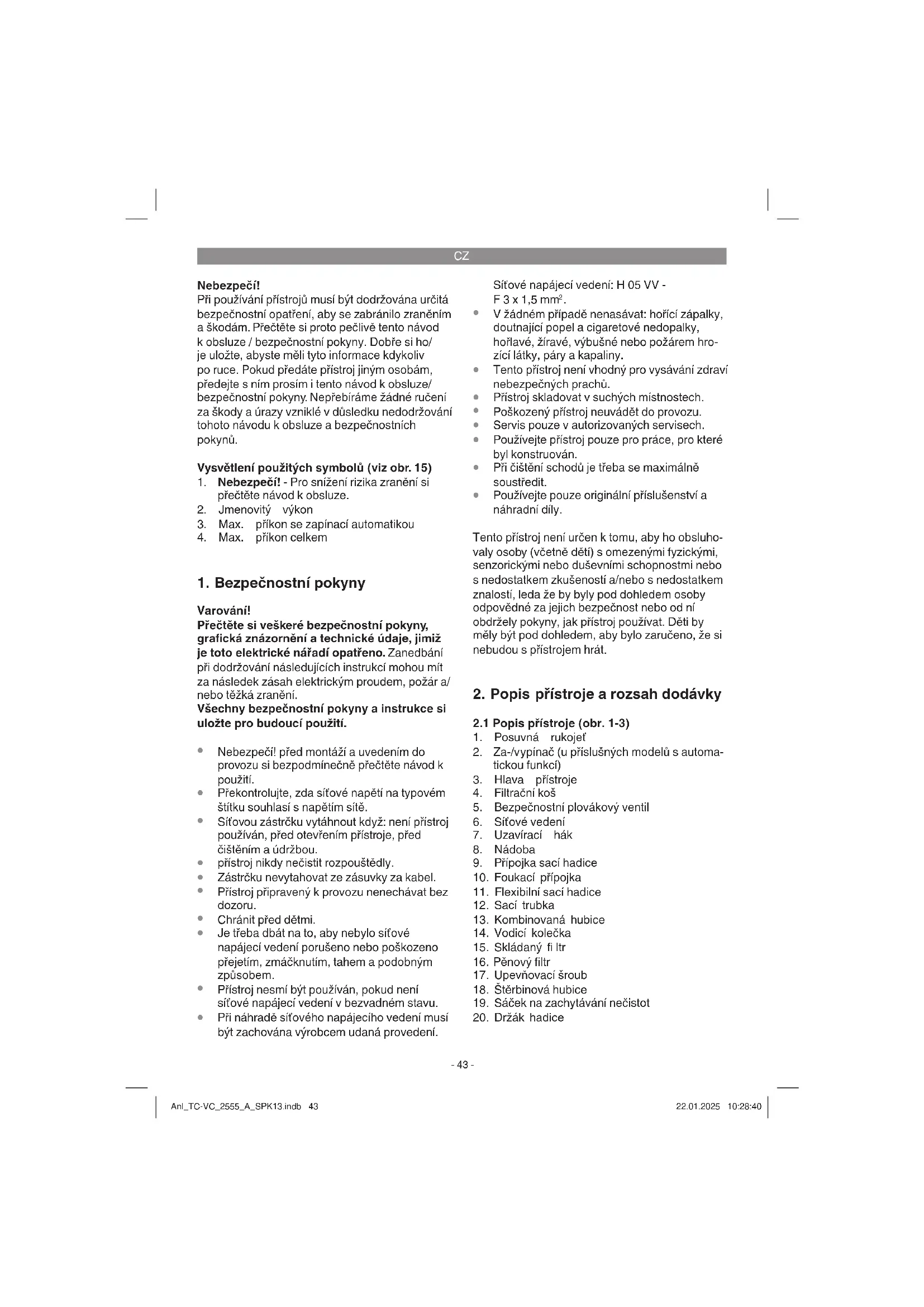Upozornění! Vysavač pro vysávání za mokra i za sucha nikdy nepoužívejte bez fi ltrů! Vždy dbejte na správné upevnění fi ltrů! Anl_TC-VC_2555_A_SPK13.indb 44Anl_TC-VC_2555_A_SPK13.indb 44 22.01.2025 10:28:4122.01.2025 10:28:41CZ