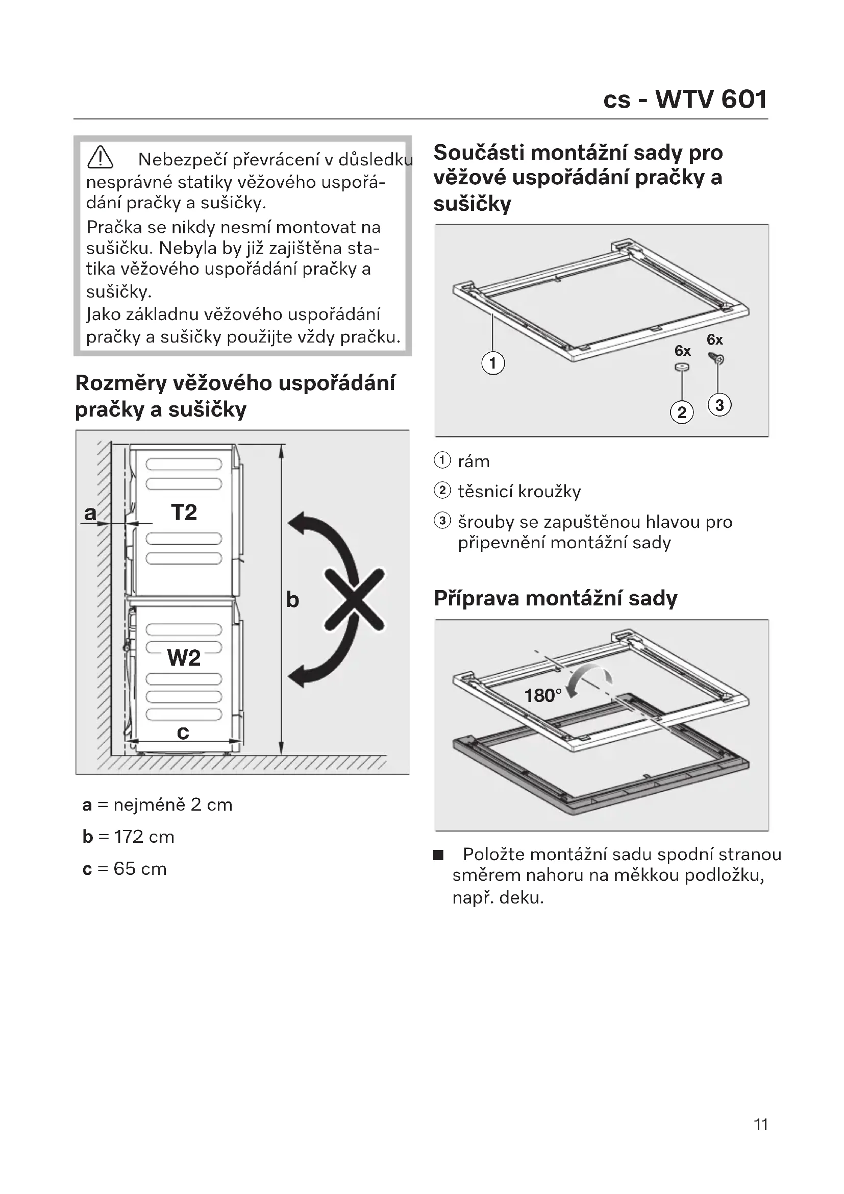 a = nejméně 2cm b = 172cm c = 65cm Součásti montážní sady pro věžové uspořádání pračky a sušičky