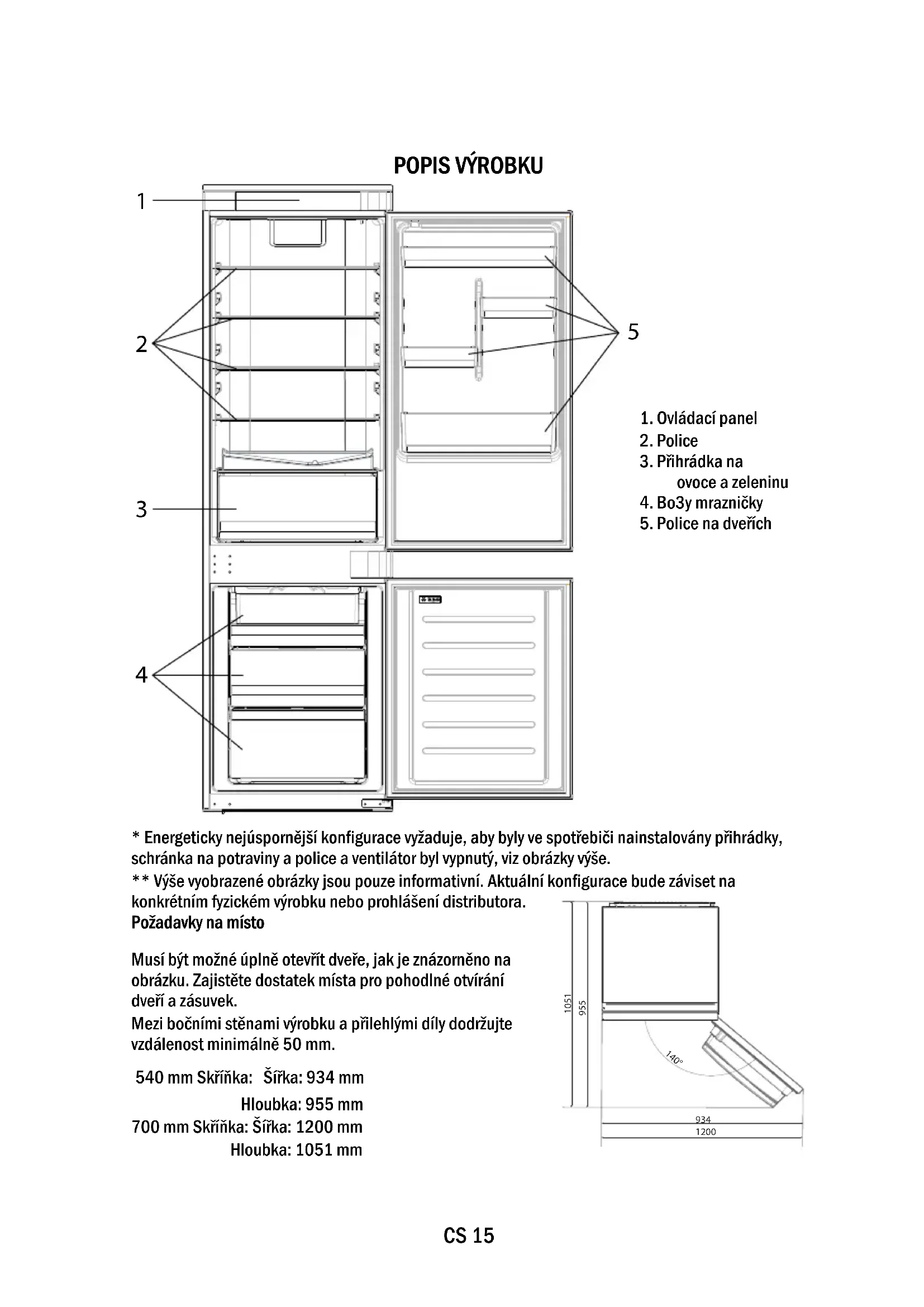 - Energeticky nejúspornější konfigurace vyžaduje, aby byly ve spotřebiči nainstalovány přihrádky, schránka na potraviny a police a ventilátor byl vypnutý, viz obrázky výše. ** Výše vyobrazené obrázky jsou pouze informativní. Aktuální konfigurace bude záviset na konkrétním fyzickém výrobku nebo prohlášení distributora. Požadavky na místo Musí být možné úplně otevřít dveře, jak je znázorněno na obrázku. Zajistěte dostatek místa pro pohodlné otvírání dveří a zásuvek. Mezi bočními stěnami výrobku a přilehlými díly dodržujte vzdálenost minimálně 50 mm. 540 mm Skříňka: Šířka: 934 mm
