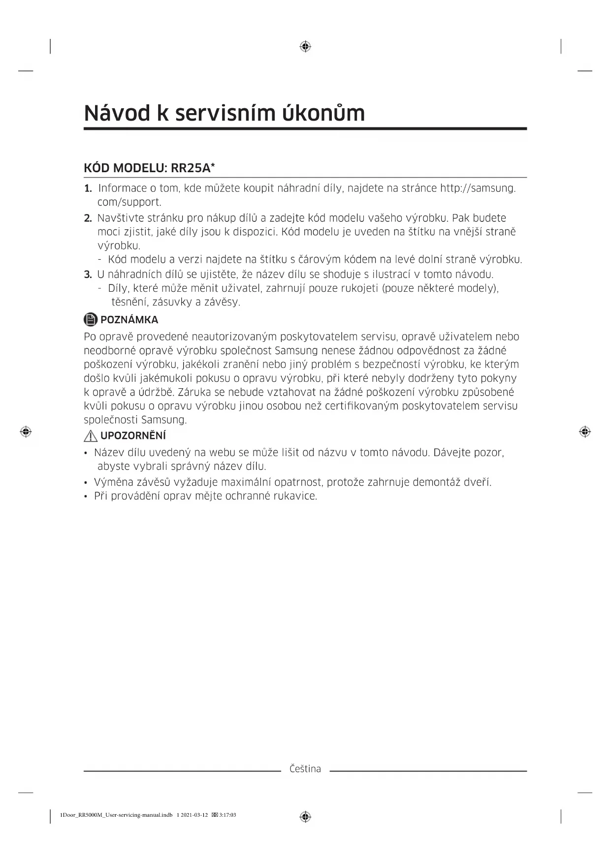 - Při provádění oprav mějte ochranné rukavice. 1Door_RR5000M_User-servicing-manual.indb 1 2021-03-12 3:17:03Čeština Skutečný vzhled a součásti chladničky se mohou od obrázku v závislosti na modelu a zemi, ve které se nacházíte, lišit.
