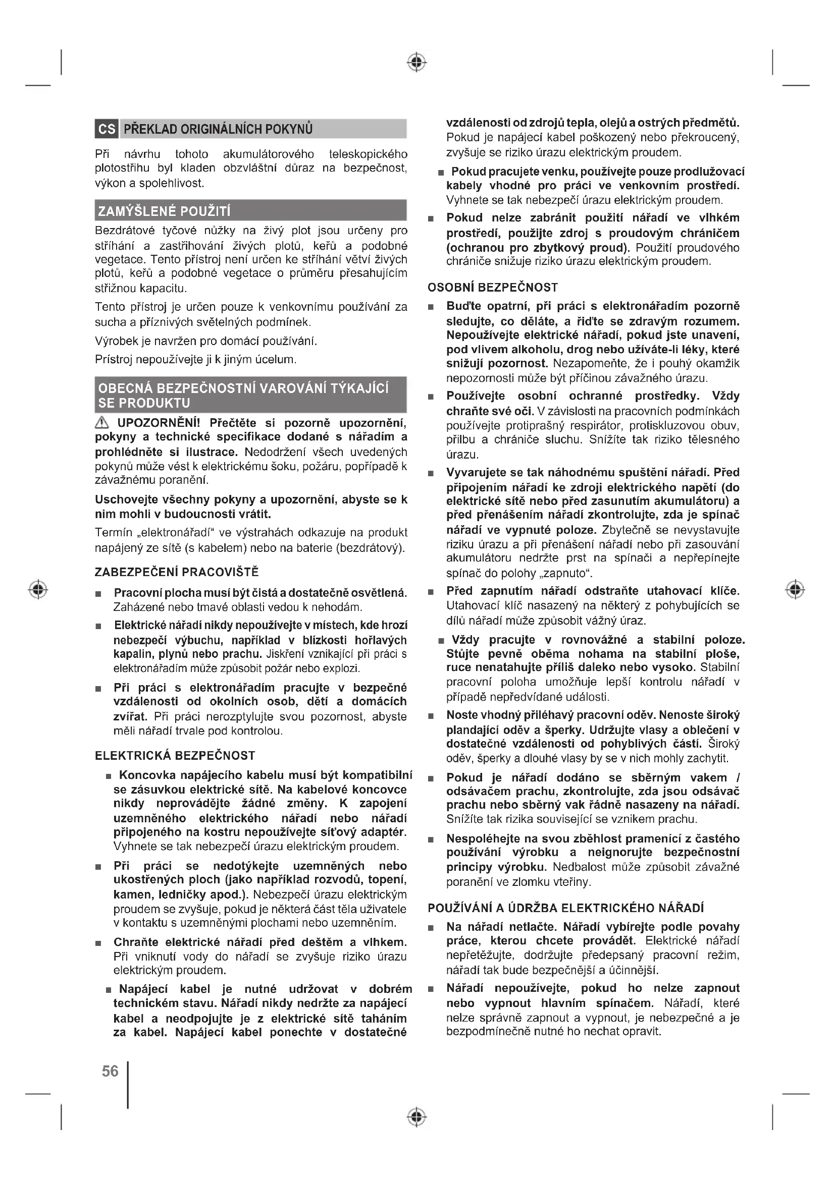 Přenos baterií dle místních a národních opatření a předpisů. Dodržujte všechny zvláštní požadavky na balení a značení při transportu baterií třetí stranou. Zajistěte, aby žádné baterie nepřišly do kontaktu s jinými bateriemi nebo vodivými materiály při transportu pomocí ochrany nekrytých kontaktů prostřednictvím izolace, nevodivých krytek či lepicích pásek. Neprepravujte prasklé nebo baterie s unikajícím elektrolytem. Ptejte se u zásilkové společnosti na další radu. ÚDRŽBA ■ Používejte pouze originální příslušenství, doplňky a náhradní díly výrobce. Zanedbání může zapříčinit možné poranění, slabý výkon a může dojít ke ztrátě záruky. ■ Údržba vyžaduje extrémní péči a znalosti a měla by být prováděna pouze kvalifikovaným servisním technikem. Výrobek nechte opravit pouze v pověřeném servisu. ■ Řezací nože jsou velmi ostré. Abyste zabránili úrazu, věnujte mimořádnou pozornost čištění, mazání, připevňování i odstraňování krytu čepele. ■ Vypnete prístroj a vyjmete akumulátor. Nechte oba zchladnout. Veškeré pohyblivé části se před jakoukoliv očistou nebo údržbou musejí kompletně zastavit.ČEŠTINA