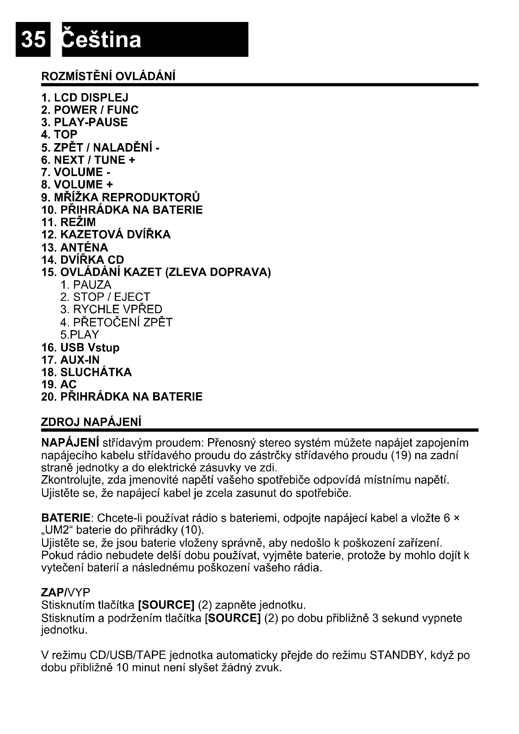 NAPÁJENÍ střídavým proudem: Přenosný stereo systém můžete napájet zapojením napájecího kabelu střídavého proudu do zástrčky střídavého proudu (19) na zadní straně jednotky a do elektrické zásuvky ve zdi. Zkontrolujte, zda jmenovité napětí vašeho spotřebiče odpovídá místnímu napětí. Ujistěte se, že napájecí kabel je zcela zasunut do spotřebiče. BATERIE: Chcete-li používat rádio s bateriemi, odpojte napájecí kabel a vložte 6 × „UM2“ baterie do přihrádky (10). Ujistěte se, že jsou baterie vloženy správně, aby nedošlo k poškození zařízení. Pokud rádio nebudete delší dobu používat, vyjměte baterie, protože by mohlo dojít k vytečení baterií a následnému poškození vašeho rádia. ZAP/VYP Stisknutím tlačítka [SOURCE] (2) zapněte jednotku. Stisknutím a podržením tlačítka [SOURCE] (2) po dobu přibližně 3 sekund vypnete jednotku. V režimu CD/USB/TAPE jednotka automaticky přejde do režimu STANDBY, když po dobu přibližně 10 minut není slyšet žádný zvuk.36 Čeština