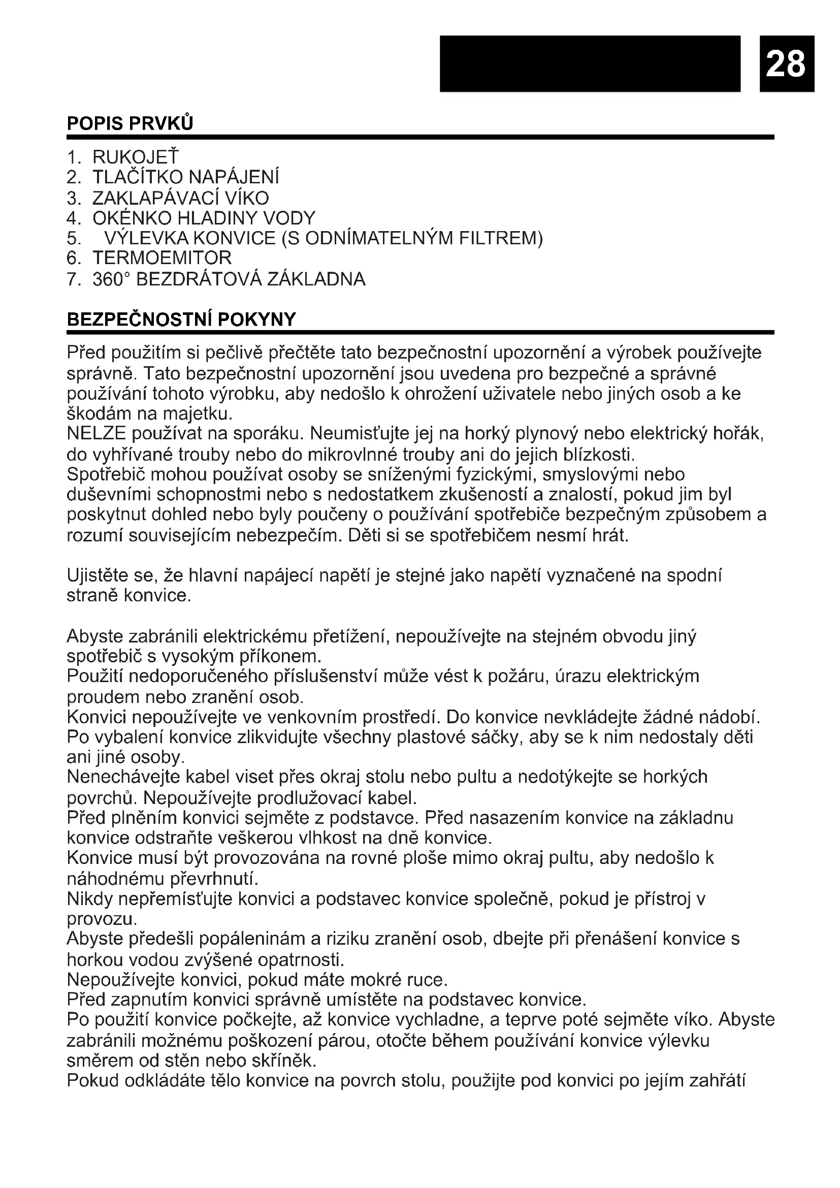 Před použitím si pečlivě přečtěte tato bezpečnostní upozornění a výrobek používejte správně. Tato bezpečnostní upozornění jsou uvedena pro bezpečné a správné používání tohoto výrobku, aby nedošlo k ohrožení uživatele nebo jiných osob a ke škodám na majetku. NELZE používat na sporáku. Neumisťujte jej na horký plynový nebo elektrický hořák, do vyhřívané trouby nebo do mikrovlnné trouby ani do jejich blízkosti. Spotřebič mohou používat osoby se sníženými fyzickými, smyslovými nebo duševními schopnostmi nebo s nedostatkem zkušeností a znalostí, pokud jim byl poskytnut dohled nebo byly poučeny o používání spotřebiče bezpečným způsobem a rozumí souvisejícím nebezpečím. Děti si se spotřebičem nesmí hrát. Ujistěte se, že hlavní napájecí napětí je stejné jako napětí vyznačené na spodní straně konvice. Abyste zabránili elektrickému přetížení, nepoužívejte na stejném obvodu jiný spotřebič s vysokým příkonem. Použití nedoporučeného příslušenství může vést k požáru, úrazu elektrickým proudem nebo zranění osob. Konvici nepoužívejte ve venkovním prostředí. Do konvice nevkládejte žádné nádobí. Po vybalení konvice zlikvidujte všechny plastové sáčky, aby se k nim nedostaly děti ani jiné osoby. Nenechávejte kabel viset přes okraj stolu nebo pultu a nedotýkejte se horkých povrchů. Nepoužívejte prodlužovací kabel. Před plněním konvici sejměte z podstavce. Před nasazením konvice na základnu konvice odstraňte veškerou vlhkost na dně konvice. Konvice musí být provozována na rovné ploše mimo okraj pultu, aby nedošlo k náhodnému převrhnutí. Nikdy nepřemísťujte konvici a podstavec konvice společně, pokud je přístroj v provozu. Abyste předešli popáleninám a riziku zranění osob, dbejte při přenášení konvice s horkou vodou zvýšené opatrnosti. Nepoužívejte konvici, pokud máte mokré ruce. Před zapnutím konvici správně umístěte na podstavec konvice. Po použití konvice počkejte, až konvice vychladne, a teprve poté sejměte víko. Abyste zabránili možnému poškození párou, otočte během používání konvice výlevku směrem od stěn nebo skříněk. Pokud odkládáte tělo konvice na povrch stolu, použijte pod konvici po jejím zahřátí29 Čeština ochrannou podložku, abyste zabránili poškození povrchů. Abyste snížili riziko požáru nebo úrazu elektrickým proudem, neodstraňujte spodní kryt ze základny ani základnu nebo konvici nijak nerozebírejte. Uvnitř se nenacházejí žádné díly, které by mohl uživatel opravovat. Opravy by měl provádět pouze autorizovaný servisní personál. Otevření základny nebo konvice bude mít za následek ztrátu dvouleté záruky. Nepoužívejte konvici v přítomnosti výbušných a/nebo hořlavých výparů. Nepoužívejte konvici k jinému než určenému účelu. Tento spotřebič je určen pouze pro použití v domácnosti.