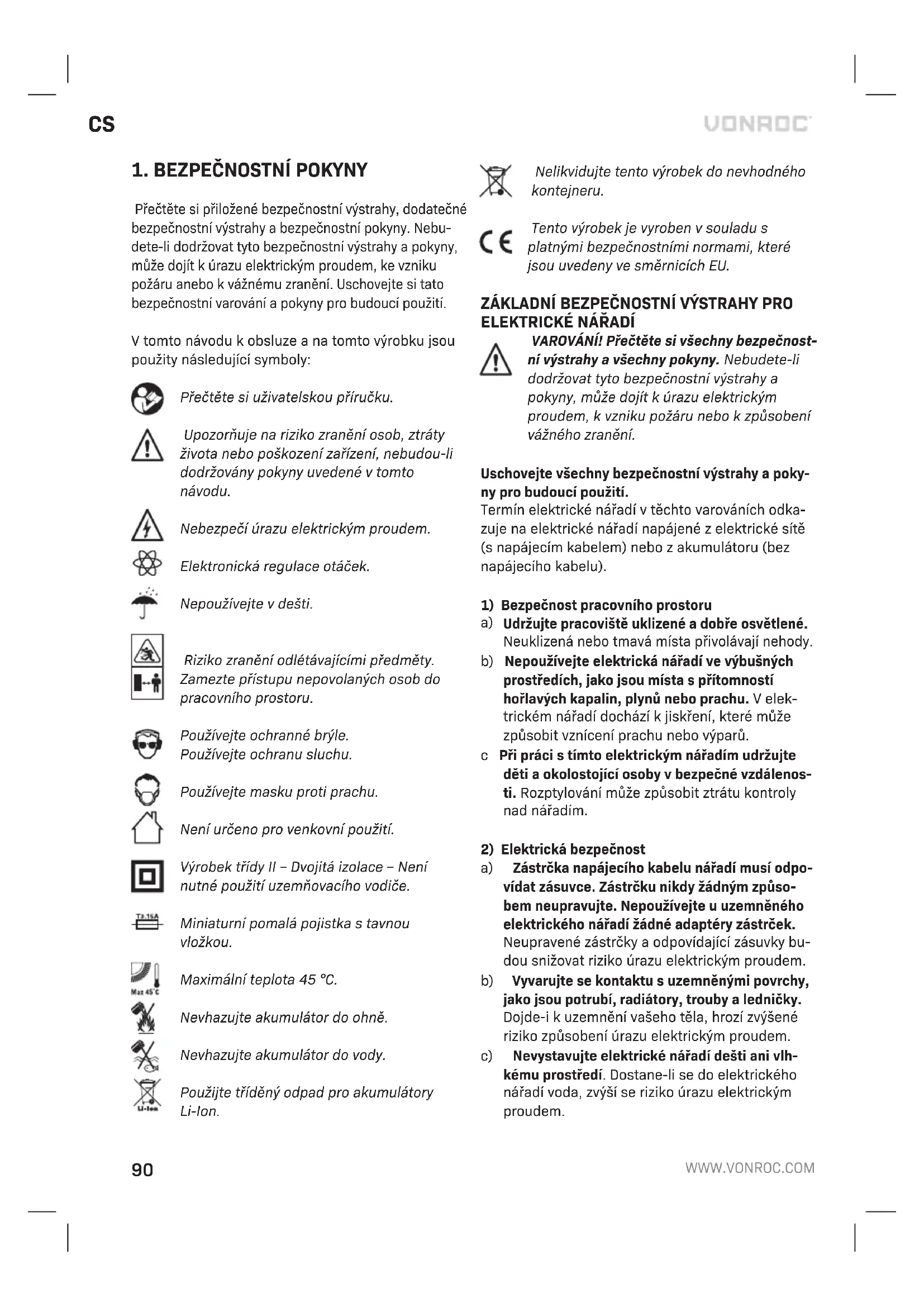 Nářadí před čištěním a prováděním údržby vždy vypněte a vyjměte z něj akumulátor. Pravidelně čistěte kryt zařízení jemným hadříkem, ideálně po každém použití. Ujistěte se, zda nejsou větrací otvory zaneseny prachem nebo jinými nečistotami. Odolnější nečistoty odstraňte pomocí jemného hadříku navlhčeného v mýdlové pěně. Nepoužívejte žádná rozpouštědla, jako jsou benzín, líh, čpavek atd. Takové chemické látky mohou způ- sobit poškození dílů z umělé hmoty. ZÁRUKA Výrobky VONROC jsou vyvíjeny v souladu s požadav- ky norem na nejvyšší kvalitu a je zaručeno, že po dobu platné záruky, která začíná běžet dnem původ- ního nákupu, nebudou na těchto výrobcích žádné vady materiálu, ani vady způsobené špatným dílen- ským zpracováním. Dojde-li během tohoto období k závadě v důsledku vady materiálu nebo dílenského zpracování, kontaktujte přímo firmu VONROC. Z této záruky jsou vyloučeny následující případy: