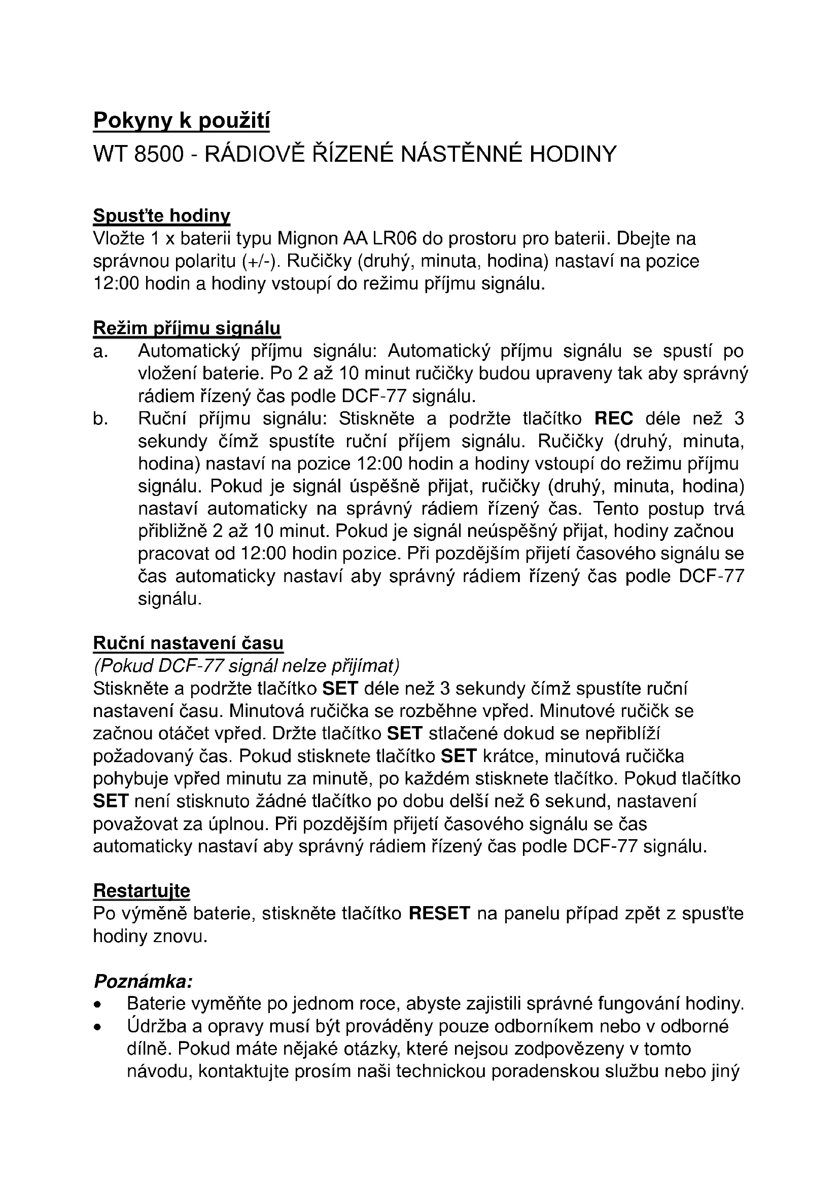 Avviare l'orologio Inserire 1 x Mignon AA LR06 batteria rispettando la polarità (+/-) nel vano batteria. Le lancette (secondi, minuti, ora) si stanno adattando alla posizione delle 12:00 ore e l'orologio entra nella modalità di ricezione del segnale. Modalità di ricezione del segnale a. La ricezione automatica del segnale: La ricezione automatica del segnale inizia con l'inserimento della batteria. Dopo 2 a 10 minuti le lancette saranno regolate al tempo corretta radio controllato secondo il ricezione di segnale DCF-77. b. La ricezione manuale del segnale: Premere e tenere il pulsante REC più di 3 secondi per avviare la ricezione manuale del segnale. Le lancette (secondi, minuti, ora) si stanno adattando alla posizione delle 12:00 ore e l'orologio entra nella modalità di ricezione del segnale. Se il segnale viene ricevuto correttamente, le lancette si stanno adattando automaticamente alla tempo corretta radio controllato. Questa procedura richiede circa 2 a 10 minuti. Se la ricezione del segnale è fallito, l'orologio inizia a lavorare dalle posizione 12 ore. Dopo il prossima ricezione successo del segnale, il tempo sarà regolata al tempo corretta radio controllato secondo il ricezione di segnale DCF-77. Impostazione manuale dell'ora (se nessun segnale DCF-77 viene ricevuto) Premere e tenere il pulsante SET più di 3 secondi per avviare il impostazione manuale dell’ora. La lancetta dei minuti inizia a correre in avanti. Tenere il tasto SET premuto fino a quando il tempo desiderato è impostato. Se si preme brevemente il tasto SET, la lancetta dei minuti ogni volta si muove in avanti di un minuto. Se il pulsante SET non viene premuto per più di 6 secondi, l'impostazione è considerato completo. Dopo il prossima ricezione successo del segnale, il tempo sarà regolata al tempo corretta radio controllato secondo il ricezione di segnale DCF-77. Reimpostazione Dopo sostituzione della batteria, premere il tasto RESET sul pannello posteriore per ri-avviare l'orologio. Suggerimenti: Al fine di garantire il corretto funzionamento dell'orologio, sostituire la batteria dopo un anno. La manutenzione e le riparazioni devono essere eseguite solo da un esperto o di una officina specializzata. Se avete domande che non trovano risposta in questo manuale, si prega di contattare il nostro Servizio di Consulenza Tecnica o di un altro specialista. Con la presente Technotrade dichiara che questo WT 8500 è conforme ai requisiti essenziali ed alle altre disposizioni pertinenti stabilite dalla direttiva 2014/53/EU e ROHS 2011/65/CE. La dichiarazione di conformità UE originale si trova a: www.technoline.de/doc/4029665385006 Effetti ricezione ambientale L’orario ottiene l'orario preciso con tecnologia wireless. Come per tutti i dispositivo wireless, la ricezione può essere influenzata dalle seguenti circostanze: lunga distanza di trasmissione prossimità di montagne e valli in prossimità di autostrada, stazione, aeroporti, cavi di alta tensione ecc. in prossimità di cantieri tra edifici alti all'interno di edifici in cemento in prossimità di apparecchiature elettriche (computer, TV, ecc.) e di strutture metalliche all'interno di veicoli in movimento Porre l’orario in una posizione con segnale ottimale, ad es. vicino a una finestra e lontano da superfici in metallo o apparecchiature elettriche. Precauzioni Non sottoporre il dispositivo a forza eccessiva e urti. Non esporre il dispositivo a temperature estreme, luce solare diretta, polvere o umidità. Non immergere il dispositivo in acqua. Evitare il contatto con materiali corrosivi. Non gettare il dispositivo nel fuoco perché potrebbe esplodere. Non aprire la cassa interna o manomettere i componenti di questa dispositivo. Avvertenze per l'uso sicuro delle batterie Uilizzare solo batterie alcaline. Non utilizzare batterie ricaricabili. Installare le batterie correttamente rispettando le polarità (+/-). Sostituire sempre il set completo di batterie. Non mescolare mai batterie usate e nuove. Rimuovere immediatamente le batterie scariche. Rimuovere le batterie quando non sono utilizzate. Non conservare le batterie in prossimità di oggetti metallici. Un contatto potrebbe causare un corto circuito. Non ricaricare le batterie e non gettarle nel fuoco perché potrebbero esplodere. Non esporre le batterie a temperature elevate, all'umidità o alla luce solare diretta. Tenere tutte le batterie lontano dalla portata dei bambini per evitare rischi di soffocamento. Utilizzare il prodotto solo per lo scopo previsto! Obbligo di avviso secondo la legge sulle batterie Le batterie esaurite non devono essere considerate rifiuti domestici. Le batterie smaltite nell’ambiente possono causare danni all’ambiente e alla salute. È possibile restituire gratuitamente le batterie usate al proprio rivenditore e consegnarle ai centri di raccolta. Il consumatore è tenuto per legge alla restituzione delle batterie scariche! Obbligo di avviso secondo la legge sulle dispositivi elettrici Questo simbolo indica che i dispositivi elettrici alla fine del loro ciclo di vita devono essere smaltiti separatamente dai rifiuti domestici generali. Portare il dispositivo al proprio punto di raccolta rifiuti locale o a un centro di riciclaggio. Ciò si applica in tutti i paesi dell'Unione Europea e in altri paesi Europei con sistemi di raccolta differenziata dei rifiuti.Pokyny k použití WT 8500 - RÁDIOVĚ ŘÍZENÉ NÁSTĚNNÉ HODINY Spusťte hodiny Vložte 1 x baterii typu Mignon AA LR06 do prostoru pro baterii. Dbejte na správnou polaritu (+/-). Ručičky (druhý, minuta, hodina) nastaví na pozice 12:00 hodin a hodiny vstoupí do režimu příjmu signálu. Režim příjmu signálu a. Automatický příjmu signálu: Automatický příjmu signálu se spustí po vložení baterie. Po 2 až 10 minut ručičky budou upraveny tak aby správný rádiem řízený čas podle DCF-77 signálu. b. Ruční příjmu signálu: Stiskněte a podržte tlačítko REC déle než 3 sekundy čímž s