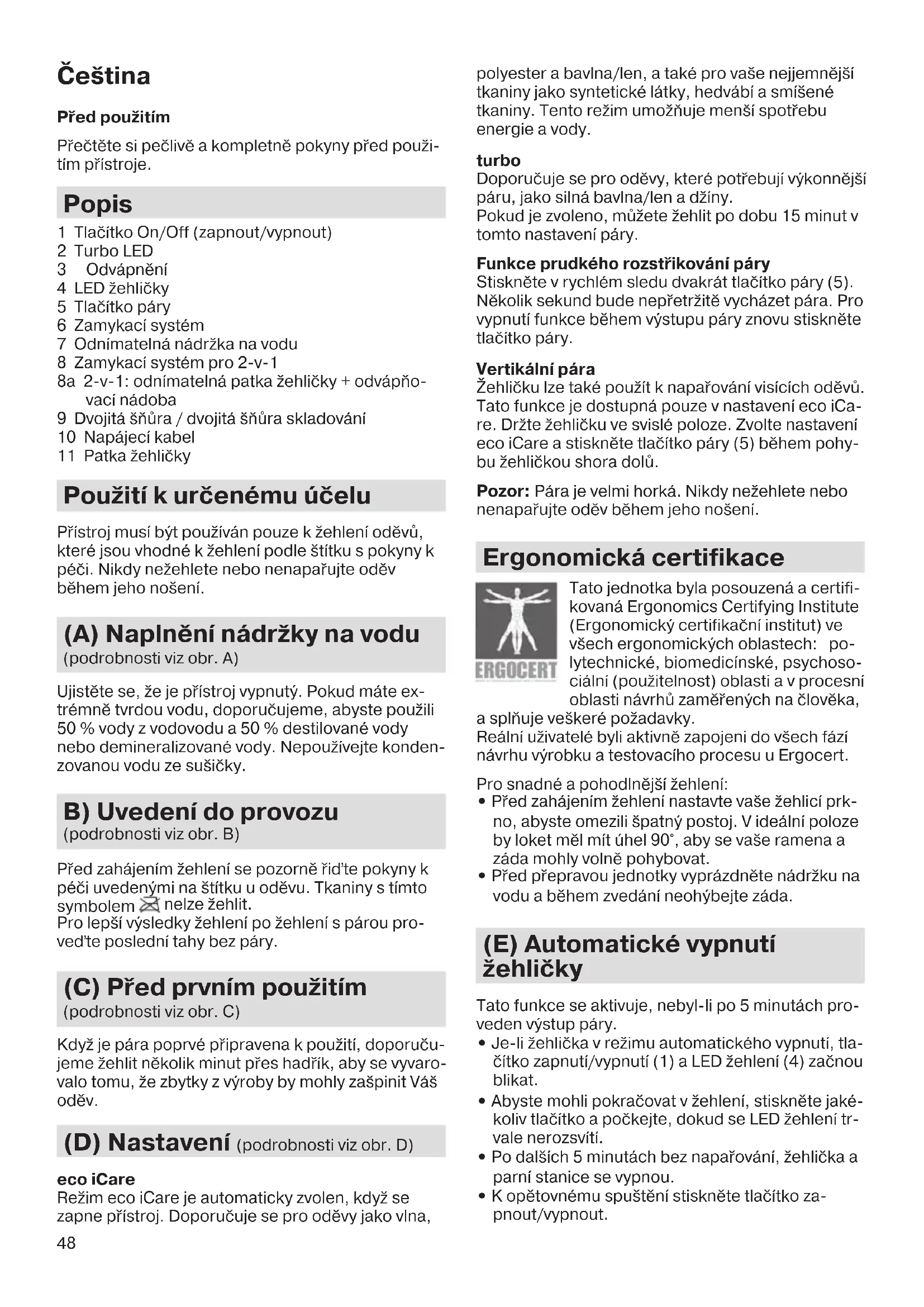 - Před přepravou jednotky vyprázdněte nádržku na vodu a během zvedání neohýbejte záda. (E) Automatické vypnutí žehličky Tato funkce se aktivuje, nebyl-li po 5 minutách pro- veden výstup páry.