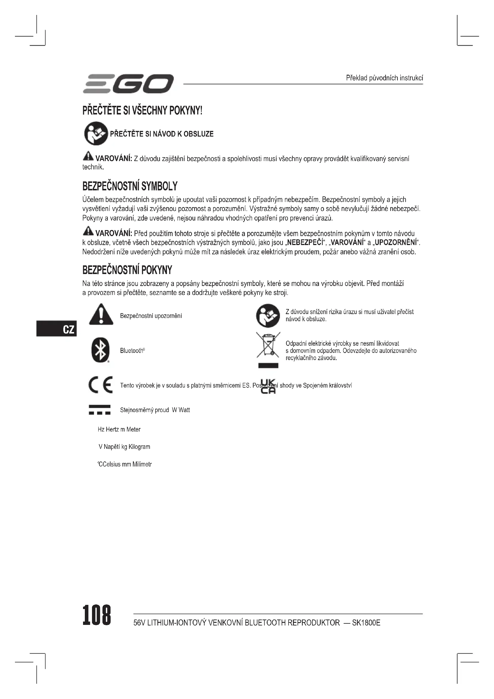 Na této stránce jsou zobrazeny a popsány bezpečnostní symboly, které se mohou na výrobku objevit. Před montáží a provozem si přečtěte, seznamte se a dodržujte veškeré pokyny ke stroji. Bezpečnostní upozorněníZ důvodu snížení rizika úrazu si musí uživatel přečíst návod k obsluze.Bluetooth Odpadní elektrické výrobky se nesmí likvidovat s domovním odpadem. Odevzdejte do autorizovaného recyklačního závodu.Tento výrobek je v souladu s platnými směrnicemi ES. Posouzení shody ve Spojeném královstvíStejnosměrný proud W Watt Hz Hertz m MeterV Napětí kg Kilogram C Celsius mm Milimetr Překlad původních instrukcí109