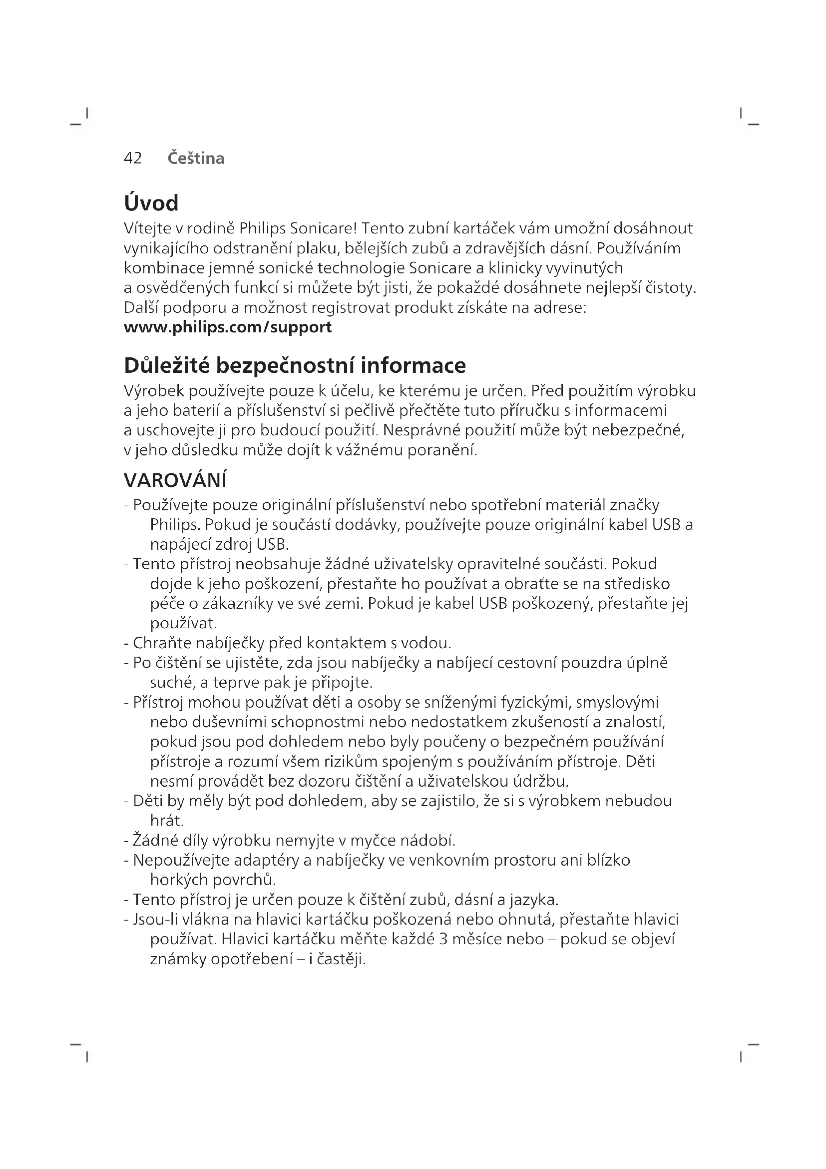 Čeština Úvod Vítejte vrodině Philips Sonicare! Tento zubní kartáček vám umožní dosáhnout vynikajícího odstranění plaku, bělejších zubů azdravějších dásní. Používáním kombinace jemné sonické technologie Sonicare aklinicky vyvinutých aosvědčených funkcí si můžete být jisti, že pokaždé dosáhnete nejlepší čistoty. Další podporu amožnost registrovat produkt získáte na adrese: www.philips.com/support Důležité bezpečnostní informace Výrobek používejte pouze kúčelu, ke kterému je určen. Před použitím výrobku ajeho baterií apříslušenství si pečlivě přečtěte tuto příručku sinformacemi auschovejte ji pro budoucí použití. Nesprávné použití může být nebezpečné, vjeho důsledku může dojít kvážnému poranění. VAROVÁNÍ - Používejte pouze originální příslušenství nebo spotřební materiál značky Philips. Pokud je součástí dodávky, používejte pouze originální kabel USB a napájecí zdroj USB. - Tento přístroj neobsahuje žádné uživatelsky opravitelné součásti. Pokud dojde kjeho poškození, přestaňte ho používat a obraťte se na středisko péče ozákazníky ve své zemi. Pokud je kabel USB poškozený, přestaňte jej používat. - Chraňte nabíječky před kontaktem svodou. - Po čištění se ujistěte, zda jsou nabíječky anabíjecí cestovní pouzdra úplně suché, a teprve pak je připojte. - Přístroj mohou používat děti a osoby se sníženými fyzickými, smyslovými nebo duševními schopnostmi nebo nedostatkem zkušeností a znalostí, pokud jsou pod dohledem nebo byly poučeny obezpečném používání přístroje a rozumí všem rizikům spojeným spoužíváním přístroje. Děti nesmí provádět bez dozoru čištění auživatelskou údržbu. - Děti by měly být pod dohledem, aby se zajistilo, že si svýrobkem nebudou hrát. - Žádné díly výrobku nemyjte vmyčce nádobí. - Nepoužívejte adaptéry anabíječky ve venkovním prostoru ani blízko horkých povrchů. - Tento přístroj je určen pouze kčištění zubů, dásní ajazyka. - Jsou-li vlákna na hlavici kartáčku poškozená nebo ohnutá, přestaňte hlavici používat. Hlavici kartáčku měňte každé 3měsíce nebo – pokud se objeví známky opotřebení – ičastěji.43 Čeština - Produkt nesmí přijít do přímého kontaktu sprodukty, které obsahují esenciální oleje nebo kokosový olej. Kontakt může způsobit uvolnění vláken. - Možno používat do nadmořské výšky 4500metrů.