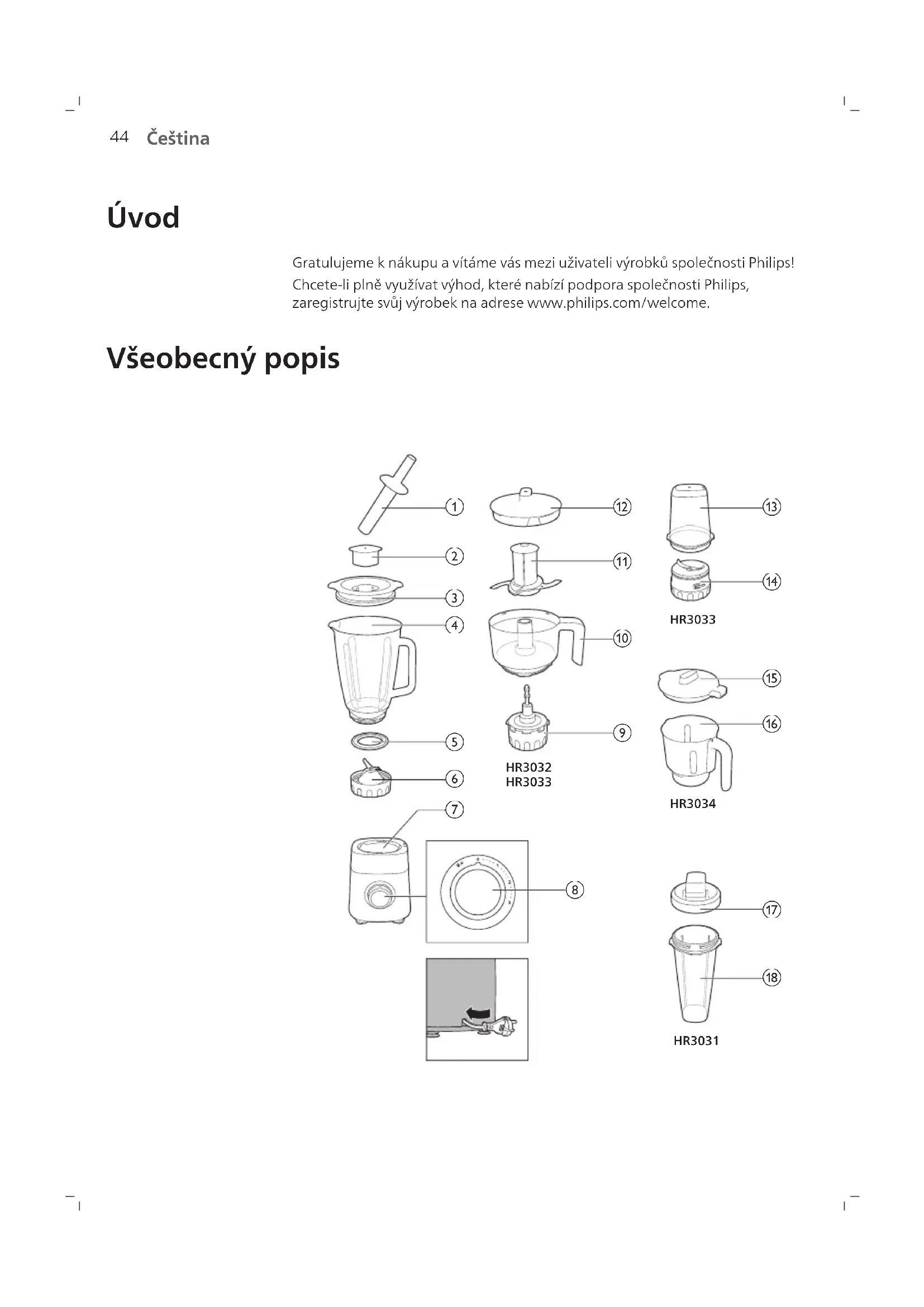 Čeština Čeština Úvod Gratulujeme knákupu avítáme vás mezi uživateli výrobků společnosti Philips! Chcete-li plně využívat výhod, které nabízí podpora společnosti Philips, zaregistrujte svůj výrobek na adrese www.philips.com/welcome. Všeobecný popis HR3034HR3031 HR3033HR3032 HR3033