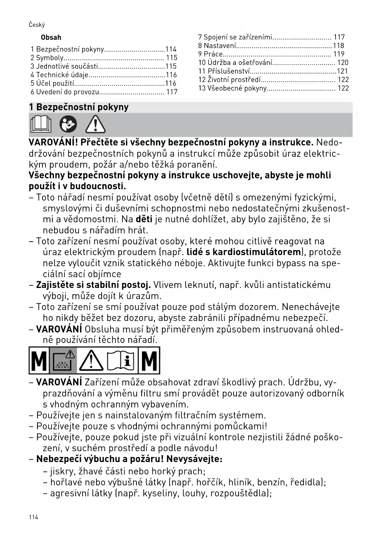 - 13 Všeobecné pokyny 1 Bezpečnostní pokyny VAROVÁNÍ! Přečtěte si všechny bezpečnostní pokyny ainstrukce. Nedo držování bezpečnostních pokynů ainstrukcí může způsobit úraz elektric kým proudem, požár a/nebo těžká poranění. Všechny bezpečnostní pokyny ainstrukce uschovejte, abyste je mohli použít ivbudoucnosti. – Toto nářadí nesmí používat osoby (včetně dětí) somezenými fyzickými, smyslovými či duševními schopnostmi nebo nedostatečnými zkušenost mi avědomostmi. Na děti je nutné dohlížet, aby bylo zajištěno, že si nebudou snářadím hrát. – Toto zařízení nesmí používat osoby, které mohou citlivě reagovat na úraz elektrickým proudem (např. lidé s kardiostimulátorem), protože nelze vyloučit vznik statického néboje. Aktivujte funkci bypass na spe ciální sací objímce – Zajistěte si stabilní postoj. Vlivem leknutí, např. kvůli antistatickému výboji, může dojít kúrazům. – Toto zařízení se smí používat pouze pod stálým dozorem. Nenechávejte ho nikdy běžet bez dozoru, abyste zabránili případnému nebezpečí. – VAROVÁNÍ Obsluha musí být přiměřeným způsobem instruovaná ohled ně používání těchto nářadí. – VAROVÁNÍ Zařízení může obsahovat zdraví škodlivý prach. Údržbu, vy prazdňování avýměnu filtru smí provádět pouze autorizovaný odborník svhodným ochranným vybavením. – Používejte jen snainstalovaným filtračním systémem. – Používejte pouze svhodnými ochrannými pomůckami! – Používejte, pouze pokud jste při vizuální kontrole nezjistili žádné poško zení, vsuchém prostředí apodle návodu! – Nebezpečí výbuchu apožáru! Nevysávejte: – jiskry, žhavé části nebo horký prach; – hořlavé nebo výbušné látky (např. hořčík, hliník, benzín, ředidla); – agresivní látky (např. kyseliny, louhy, rozpouštědla); Český 114– chemicky reaktivní látky, které vedou kvzniku tepla, kyselin/zásad, plynů atd. (např. reaktivní dvousložkové materiály, hliník avoda). – Dodržujte národní bezpečnostní předpisy ařiďte se údaji výrobce mate riálu! – VAROVÁNÍ Zásuvku na zařízení používejte pouze kúčelům, které jsou stanovené vnávodu. – Pravidelně kontrolujte zástrčku, zásuvku, kabel afiltr, abyste zabránili ohrožení. Poškozené elektrické součásti nechte vyměnit výhradně vau torizovaném zákaznickém servisu. – Před čištěním nebo výměnou opotřebovaných dílů nebo při přestavbě zařízení se musí vždy nejprve odpojit síťová zástrčka ze zásuvky. – POZOR Pravidelně čistěte zařízení omezující hladinu vody akontrolujte, zda nevykazuje známky poškození. – VAROVÁNÍ Uniká-li pěna nebo kapalina, zařízení ihned vypněte. – Používejte pouze originální sací hadici Festool. – Zohledněte příslušné pracoviště apři přepravě nebo práci se zaříze ním dávejte pozor na sebe ana ostatní. Zabráníte tak např. zakopnutí osací hadici nebo síťový kabel. – Zařízení přenášejte jen za držadlo, které je ktomu určené. – Nezvedejte anepřemisťujte pomocí háku jeřábu nebo zvedacího zaříze ní. – Balicí fólie nepatří do rukou dětem. Hrozí nebezpečí udušení. 2 Symboly Varování před všeobecným nebezpečím Varování před úrazem elektrickým pro udem Přečtěte si návod kpoužití, bezpeč nostní pokyny! Používejte respirátor. Rada, upozornění Instruktážní návod Varování! Zařízení může obsahovat zdraví škodlivý prach! Hodí se pro zachycení prachu smezními hodnotami expozice více než 0,1mg/m p. 122