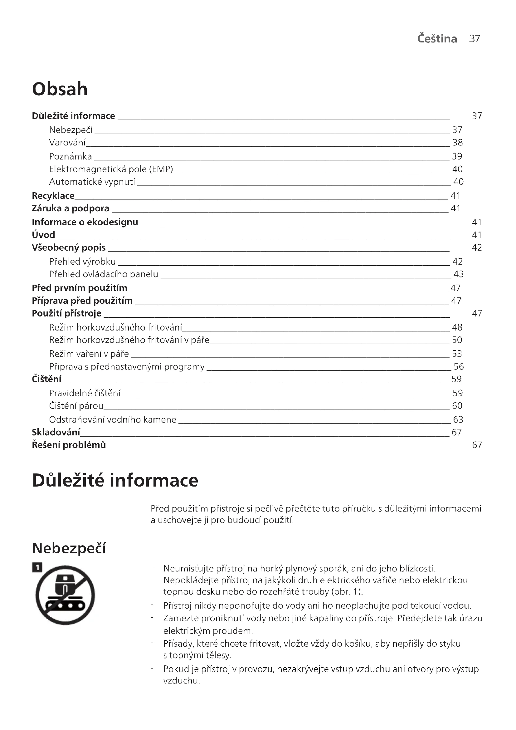 Čeština Čeština Obsah Důležité informace ________________________________________________________________________ 37 Nebezpečí _____________________________________________________________________________ 37 Varování_______________________________________________________________________________ 38 Poznámka _____________________________________________________________________________ 39 Elektromagnetická pole (EMP)____________________________________________________________ 40 Automatické vypnutí ____________________________________________________________________ 40 Recyklace_________________________________________________________________________________ 41 Záruka apodpora _________________________________________________________________________ 41 Informace oekodesignu ___________________________________________________________________ 41 Úvod _____________________________________________________________________________________ 41 Všeobecný popis __________________________________________________________________________ 42 Přehled výrobku ________________________________________________________________________ 42 Přehled ovládacího panelu _______________________________________________________________ 43 Před prvním použitím _____________________________________________________________________ 47 Příprava před použitím ____________________________________________________________________ 47 Použití přístroje ___________________________________________________________________________ 47 Režim horkovzdušného fritování__________________________________________________________ 48 Režim horkovzdušného fritování vpáře____________________________________________________ 50 Režim vaření vpáře _____________________________________________________________________ 53 Příprava spřednastavenými programy _____________________________________________________ 56 Čištění____________________________________________________________________________________ 59 Pravidelné čištění _______________________________________________________________________ 59 Čištění párou___________________________________________________________________________ 60 Odstraňování vodního kamene ___________________________________________________________ 63 Skladování________________________________________________________________________________ 67 Řešení problémů __________________________________________________________________________ 67 Důležité informace Před použitím přístroje si pečlivě přečtěte tuto příručku sdůležitými informacemi a uschovejte ji pro budoucí použití. Nebezpečí