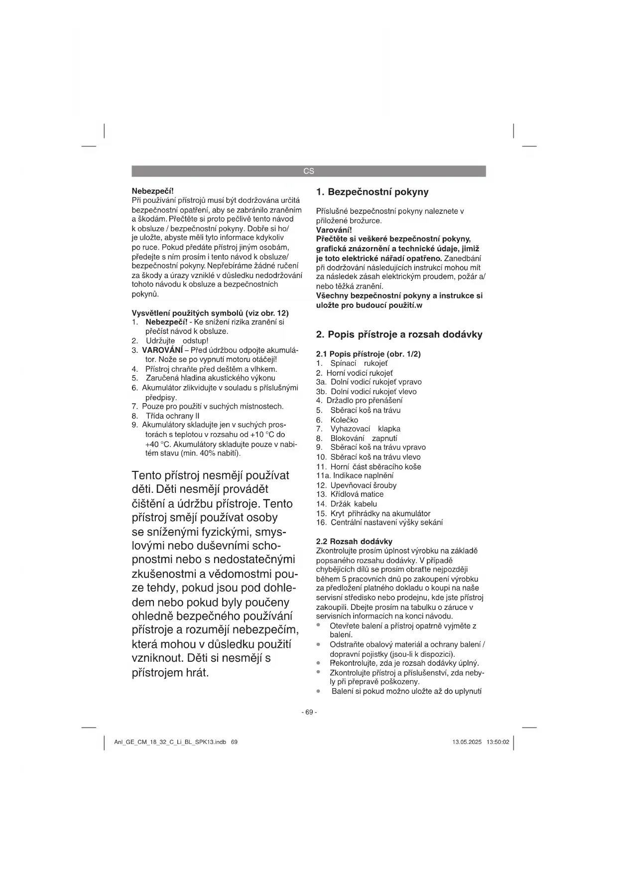 Opatrně! Bezprostředně před uvedením sekačky do pro- vozu zasuňte akumulátor a při každém přerušení nebo ukončení práce akumulátor vytáhněte. Pozor! Aby se zabránilo nechtěnému zapnutí, je sekačka vybavena blokováním zapnutí (obr. 9 / pol. 8), kte- ré se musí zmáčknout, než může být aktivována spínací páčka (obr. 9 / pol. 1). Pokud se spínací páčka pustí, sekačka se vypne. Doba startu může činit až několik sekund. Proveďte tento krok několikrát, abyste si byli jisti, že váš přístroj správně pracuje. Varování! Nikdy neotvírejte vyhazovací klap- ku, když je vyprazdňováno sběrací zařízení a motor ještě běží. Rotující nůž může způsobit zranění. Vždy pečlivě upevněte vyhazovací klapku resp. sběrací koš. Při odstraňování nejdříve vypnout motor. Musí být vždy dodržována bezpečnostní vz- dálenost mezi krytem nože a uživatelem daná vodicími rukojeťmi. Při sekání a změnách směru jízdy na stráních a svazích je nutno dávat obzvlášť pozor. Dbejte na bezpečný postoj, noste boty s neklouzavou, profi lovou podrážkou a dlouhé kalhoty. Sekejte vždy příčně ke svahu. Na svazích se sklo- nem přes 15 stupňů se z bezpečnostních důvodů nesmí sekat. Anl_GE_CM_18_32_C_Li_BL_SPK13.indb 72Anl_GE_CM_18_32_C_Li_BL_SPK13.indb 72 13.05.2025 13:50:0313.05.2025 13:50:03CS
