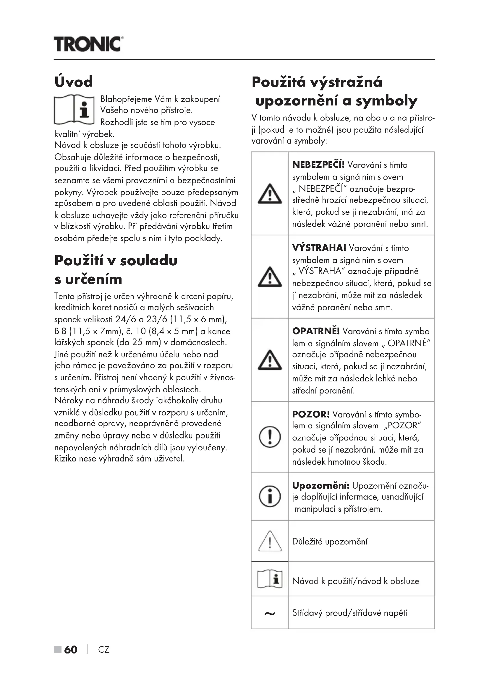 CZ Úvod Blahopřejeme Vám kzakoupení Vašeho nového přístroje. Rozhodli jste se tím pro vysoce kvalitní výrobek. Návod kobsluze je součástí tohoto výrobku. Obsahuje důležité informace obezpečnosti, použití a likvidaci. Před použitím výrobku se seznamte se všemi provozními a bezpečnostními pokyny. Výrobek používejte pouze předepsaným způsobem a pro uvedené oblasti použití. Návod k obsluze uchovejte vždy jako referenční příručku v blízkosti výrobku. Při předávání výrobku třetím osobám předejte spolu sním ityto podklady. Použití vsouladu s určením Tento přístroj je určen výhradně k drcení papíru, kreditních karet nosičů a malých sešívacích sponek velikosti 24/6 a 23/6 (11,5 x 6 mm), B-8 (11,5 x 7mm), č. 10 (8,4 x 5 mm) a kance- lářských sponek (do 25 mm) v domácnostech. Jiné použití než kurčenému účelu nebo nad jeho rámec je považováno za použití vrozporu surčením. Přístroj není vhodný kpoužití vživnos- tenských ani v průmyslových oblastech. Nároky na náhradu škody jakéhokoliv druhu vzniklé vdůsledku použití vrozporu surčením, neodborné opravy, neoprávněně provedené změny nebo úpravy nebo vdůsledku použití nepovolených náhradních dílů jsou vyloučeny. Riziko nese výhradně sám uživatel. Použitá výstražná upozornění a symboly V tomto návodu k obsluze, na obalu a na přístro- ji (pokud je to možné) jsou použita následující varování a symboly: NEBEZPEČÍ! Varování s tímto symbolem a signálním slovem „ NEBEZPEČÍ“ označuje bezpro- středně hrozící nebezpečnou situaci, která, pokud se jí nezabrání, má za následek vážné poranění nebo smrt. VÝSTRAHA! Varování s tímto symbolem a signálním slovem „ VÝSTRAHA“ označuje případně nebezpečnou situaci, která, pokud se jí nezabrání, může mít za následek vážné poranění nebo smrt. OPATRNĚ! Varování s tímto symbo- lem a signálním slovem „ OPATRNĚ“ označuje případně nebezpečnou situaci, která, pokud se jí nezabrání, může mít za následek lehké nebo střední poranění. POZOR! Varování s tímto symbo- lem a signálním slovem „POZOR“ označuje případnou situaci, která, pokud se jí nezabrání, může mít za následek hmotnou škodu. Upozornění: Upozornění označu- je doplňující informace, usnadňující manipulaci s přístrojem. Důležité upozornění Návod k použití/návod k obsluze