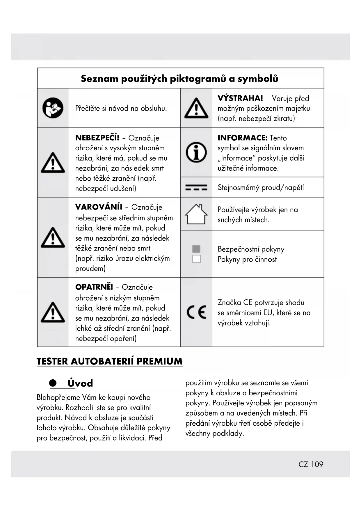 Seznam použitých piktogramů a symbolů Přečtěte si návod na obsluhu. VÝSTRAHA! –Varuje před možným poškozením majetku (např. nebezpečí zkratu) NEBEZPEČÍ! –Označuje ohrožení s vysokým stupněm rizika, které má, pokud se mu nezabrání, za následek smrt nebo těžké zranění (např. nebezpečí udušení) INFORMACE: Tento symbol se signálním slovem „Informace“ poskytuje další užitečné informace. Stejnosměrný proud/napětí VAROVÁNÍ! –Označuje nebezpečí se středním stupněm rizika, které může mít, pokud se mu nezabrání, za následek těžké zranění nebo smrt (např. riziko úrazu elektrickým proudem) Používejte výrobek jen na suchých místech. Bezpečnostní pokyny Pokyny pro činnost OPATRNĚ! –Označuje ohrožení s nízkým stupněm rizika, které může mít, pokud se mu nezabrání, za následek lehké až střední zranění (např. nebezpečí opaření) Značka CE potvrzuje shodu se směrnicemi EU, které se na výrobek vztahují.