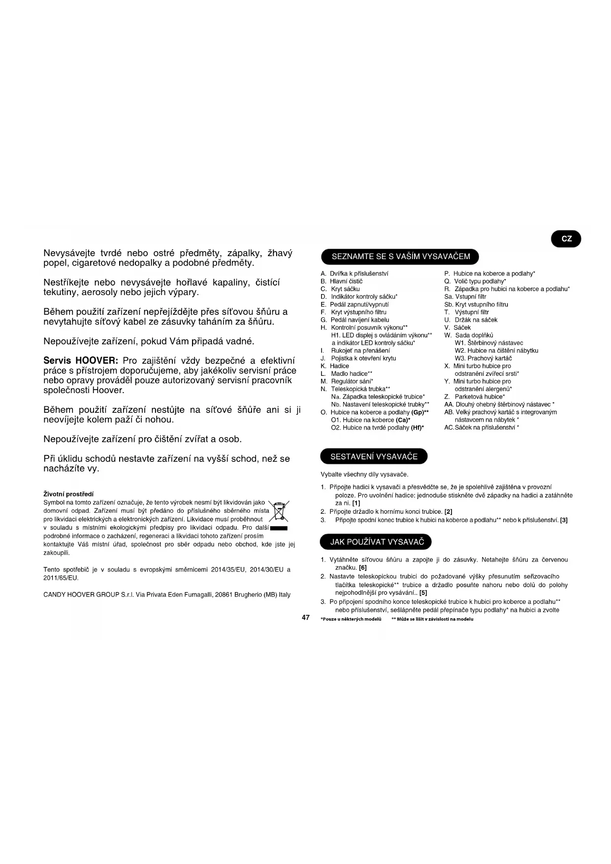 Tento vysavač by měl být používán pouze pro úklid domácnosti a v souladu s touto uživatelskou příručkou. Než začnete spotřebič používat, ujistěte se, že rozumíte tomuto návodu. Nenechávejte zařízení zapnuté v zásuvce. Před čištěním nebo jakoukoli údržbou zařízení vždy vypněte a síťovou šňůru vytáhněte ze zásuvky. Tento přístroj smí používat děti od 8 let výše a osoby se sníženými fyzickými, smyslovými nebo mentálními schopnostmi nebo s nedostatkem zkušeností a znalostí, pokud jsou pod dohledem nebo jim byly dány pokyny týkající se bezpečného používání tohoto přístroje a byly seznámeny s možnými riziky jeho používání. S přístrojem se nesmí hrát děti. Čištění a údržbu nesmí provádět děti bez dohledu. Jestliže je poškozena síťová šňůra, okamžitě přestaňte zařízení používat. Abyste se vyhnuli ohrožení bezpečnosti, napájecí kabel musí být vyměněn autorizovaným technikem společnosti HOOVER. Udržujte dostatečnou vzdálenost rukou, nohou, volného oděvu a vlasů z dosahu otočných kartáčů. Používejte výhradně příslušenství, spotřební materiál a náhradní díly doporučené nebo dodávané rmou HOOVER. Statickáelektřina:Při čištění některých koberců vzniká malé množství statické elektřiny. Výboje statické elektřiny neohrožují zdraví. Nepoužívejte Vaše zařízení venku, nebo na mokré povrchy a na mokrá vysávání. CZ47 Nevysávejte tvrdé nebo ostré předměty, zápalky, žhavý popel, cigaretové nedopalky a podobné předměty. Nestříkejte nebo nevysávejte hořlavé kapaliny, čistící tekutiny, aerosoly nebo jejich výpary. Během použití zařízení nepřejíždějte přes síťovou šňůru a nevytahujte síťový kabel ze zásuvky taháním za šňůru. Nepoužívejte zařízení, pokud Vám připadá vadné. Servis HOOVER: Pro zajištění vždy bezpečné a efektivní práce s přístrojem doporučujeme, aby jakékoliv servisní práce nebo opravy prováděl pouze autorizovaný servisní pracovník společnosti Hoover. Během použití zařízení nestůjte na síťové šňůře ani si ji neovíjejte kolem paží či nohou. Nepoužívejte zařízení pro čištění zvířat a osob. Při úklidu schodů nestavte zařízení na vyšší schod, než se nacházíte vy. Životníprostředí Symbol na tomto zařízení označuje, že tento výrobek nesmí být likvidován jako domovní odpad. Zařízení musí být předáno do příslušného sběrného místa pro likvidaci elektrických a elektronických zařízení. Likvidace musí proběhnout v souladu s místními ekologickými předpisy pro likvidaci odpadu. Pro další podrobné informace o zacházení, regeneraci a likvidaci tohoto zařízení prosím kontaktujte Váš místní úřad, společnost pro sběr odpadu nebo obchod, kde jste jej zakoupili. Tento spotřebič je v souladu s evropskými směrnicemi 2014/35/EU, 2014/30/EU a 2011/65/EU. CANDY HOOVER GROUP S.r.l. Via Privata Eden Fumagalli, 20861 Brugherio (MB) Italy