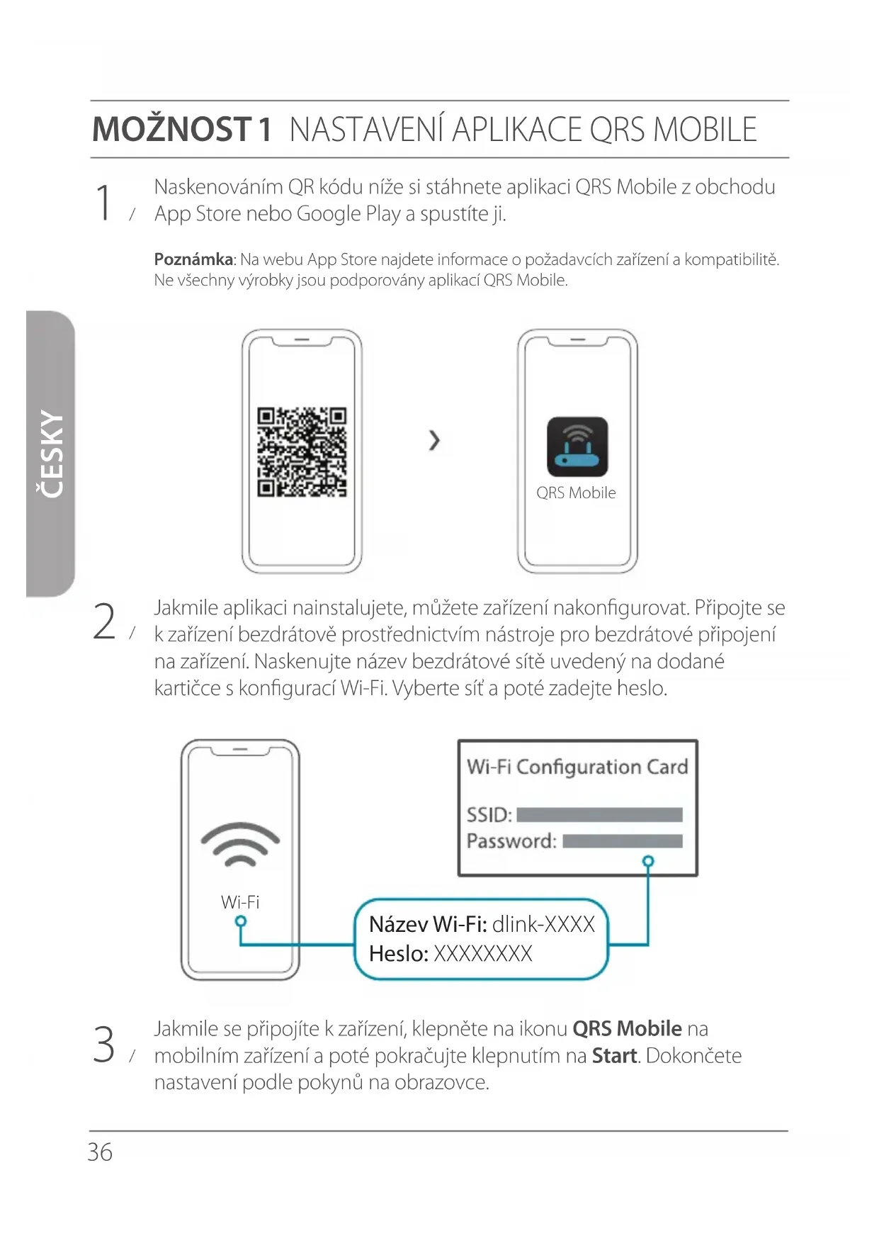 Naskenováním QR kódu níže si stáhnete aplikaci QRS Mobile z obchodu App Store nebo Google Play a spustíte ji. Poznámka: Na webu App Store najdete informace o požadavcích zařízení a kompatibilitě. Ne všechny výrobky jsou podporovány aplikací QRS Mobile. 1 / QRS MobileJakmile aplikaci nainstalujete, můžete zařízení nakonfigurovat. Připojte se k zařízení bezdrátově prostřednictvím nástroje pro bezdrátové připojení na zařízení. Naskenujte název bezdrátové sítě uvedený na dodané kartičce s konfigurací Wi-Fi. Vyberte síť a poté zadejte heslo. 2 / Wi-Fi Název Wi-Fi: dlink-XXXX Heslo: XXXXXXXX Jakmile se připojíte k zařízení, klepněte na ikonu QRS Mobile na mobilním zařízení a poté pokračujte klepnutím na Start. Dokončete nastavení podle pokynů na obrazovce. 3 /37 ČESKY