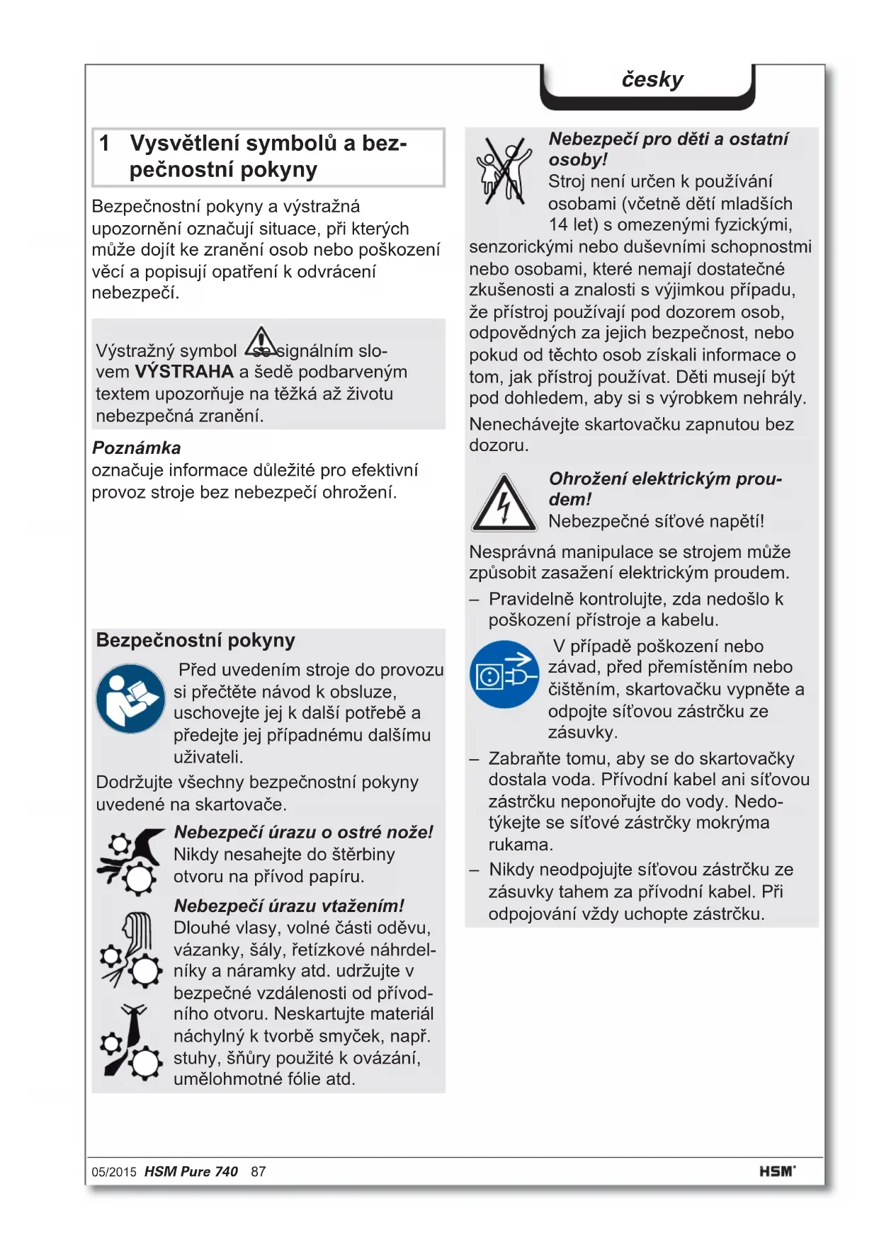 Ciężar 50 kg 56 kg Prędkość szatkowania 70 mm/s 60 mm/s Szerokość robocza cięcia 400 mm Przyłącze elektryczne 230 V, 50 Hz 120 V, 60 Hz 220 V, 60 Hz Moc przy maksymalnej liczbie arkuszy 590 W Tryb pracy praca ciągła Warunki otoczenia podczas pracy: Temperatura Względna wilgotność powietrza Wysokość n.p.m. od -10 °C do +25 °C maks. 90 %, nieskondensowane maks. 2 000 m Wymiary szer. x głęb. x wys. (mm) 620 x 487 x 889 Pojemność pojemnika na ścinki 145 l Emisja szumów (bieg jałowy/pełne obciążenie) 56 dB(A) / 59-63 dB(A)05/2015 HSM Pure 740 87 česky 1 Vysvětlení symbolů a bez- pečnostní pokyny Bezpečnostní pokyny a výstražná upozornění označují situace, při kterých může dojít ke zranění osob nebo poškození věcí a popisují opatření k odvrácení nebezpečí. Poznámka označuje informace důležité pro efektivní provoz stroje bez nebezpečí ohrožení. Výstražný symbol se signálním slo- vem VÝSTRAHA a šedě podbarveným textem upozorňuje na těžká až životu nebezpečná zranění. Bezpečnostní pokyny Před uvedením stroje do provozu si přečtěte návod k obsluze, uschovejte jej k další potřebě a předejte jej případnému dalšímu uživateli. Dodržujte všechny bezpečnostní pokyny uvedené na skartovače. Nebezpečí úrazu o ostré nože! Nikdy nesahejte do štěrbiny otvoru na přívod papíru. Nebezpečí úrazu vtažením! Dlouhé vlasy, volné části oděvu, vázanky, šály, řetízkové náhrdel- níky a náramky atd. udržujte v bezpečné vzdálenosti od přívod- ního otvoru. Neskartujte materiál náchylný k tvorbě smyček, např. stuhy, šňůry použité k ovázání, umělohmotné fólie atd. Nebezpečí pro děti a ostatní osoby! Stroj není určen k používání osobami (včetně dětí mladších 14 let) s omezenými fyzickými, senzorickými nebo duševními schopnostmi nebo osobami, které nemají dostatečné zkušenosti a znalosti s výjimkou případu, že přístroj používají pod dozorem osob, odpovědných za jejich bezpečnost, nebo pokud od těchto osob získali informace o tom, jak přístroj používat. Děti musejí být pod dohledem, aby si s výrobkem nehrály. Nenechávejte skartovačku zapnutou bez dozoru. Ohrožení elektrickým prou- dem! Nebezpečné síťové napětí! Nesprávná manipulace se strojem může způsobit zasažení elektrickým proudem. – Pravidelně kontrolujte, zda nedošlo k poškození přístroje a kabelu. V případě poškození nebo závad, před přemístěním nebo čištěním, skartovačku vypněte a odpojte síťovou zástrčku ze zásuvky. – Zabraňte tomu, aby se do skartovačky dostala voda. Přívodní kabel ani síťovou zástr čku neponořujte do vody. Nedo- týkejte se síťové zástrčky mokrýma rukama. – Nikdy neodpojujte síťovou zástrčku ze zásuvky tahem za přívodní kabel. Při odpojování vždy uchopte zástrčku.88 HSM Pure 740 05/2015 česky 2 Správné použití, odpověd- nost za vady Záruční lhůta skartovačky je 2 roky. Záruka nezávislá na odpovědnosti za vady ocelo- vých řezacích hřídelí HSM skartovačky je platná po celou dobu životnosti přístroje (doživotní záruka HSM Lifetime Warranty). Záruka a garance se nevztahuje na škody způsobené nesprávným použitím a na zásahy třetích osob do zařízení. Společnost HSM zaručuje dodání náhrad- ních dílů po dobu 10 let po ukončení výroby tohoto modelu. Skartovací stroj je určen ke skartování papíru a malého množství CD/DVD nosičů a kreditních/zákaznických karet. Robustní řezací mechanika je odolná proti sešívacím a kancelářským sponám. 3 Přehled Ovládací a zobrazovací prvky Zobrazované symboly Nádoba je plná Zobrazované symboly Připraven k provozu Tlačítko zpětného chodu Zobrazované symboly Řezný mechanismus je zablokovaný Otevřená dvířka / Bezpečnostní prvek stisknut Ovládací tlačítka 1 Dveře 2 Bezpečnostní pokyny 3 Optická závora 4 Ovládací a zobrazovací jednotka 5 Bezpečnostní prvek 6 Typový štítek 7 Síťový vypínač 1 2 3 4 5 6 705/2015 HSM Pure 740 89 česky 4 Uvedení do provozu VÝSTRAHA Nebezpečné síťové napětí! Nesprávná manipulace se strojem může způsobit zasažení elektrickým proudem. – Používejte přístroj pouze v suchých místnostech. Nepoužívejte přístroj ve vlhkých místnostech a prostorech nebo v dešti. – Chraňte přívodní kabel, přístroj a síťo- vou zástrčku před horkem, horkými předměty a před otevřeným ohněm. Větrací otvory musejí být volné a je nezbytné dodržovat vzdálenost min. 5 cm od stěn nebo od nábytku. – Dbejte, aby byla síťová zástrčka snadno přístupná. – Před připojením zástrčky k elektrické síti se přesvědčte o tom, zda se napěťové a kmitočtové hodnoty elektrické sítě sho- dují s údaji na typovém štítku.