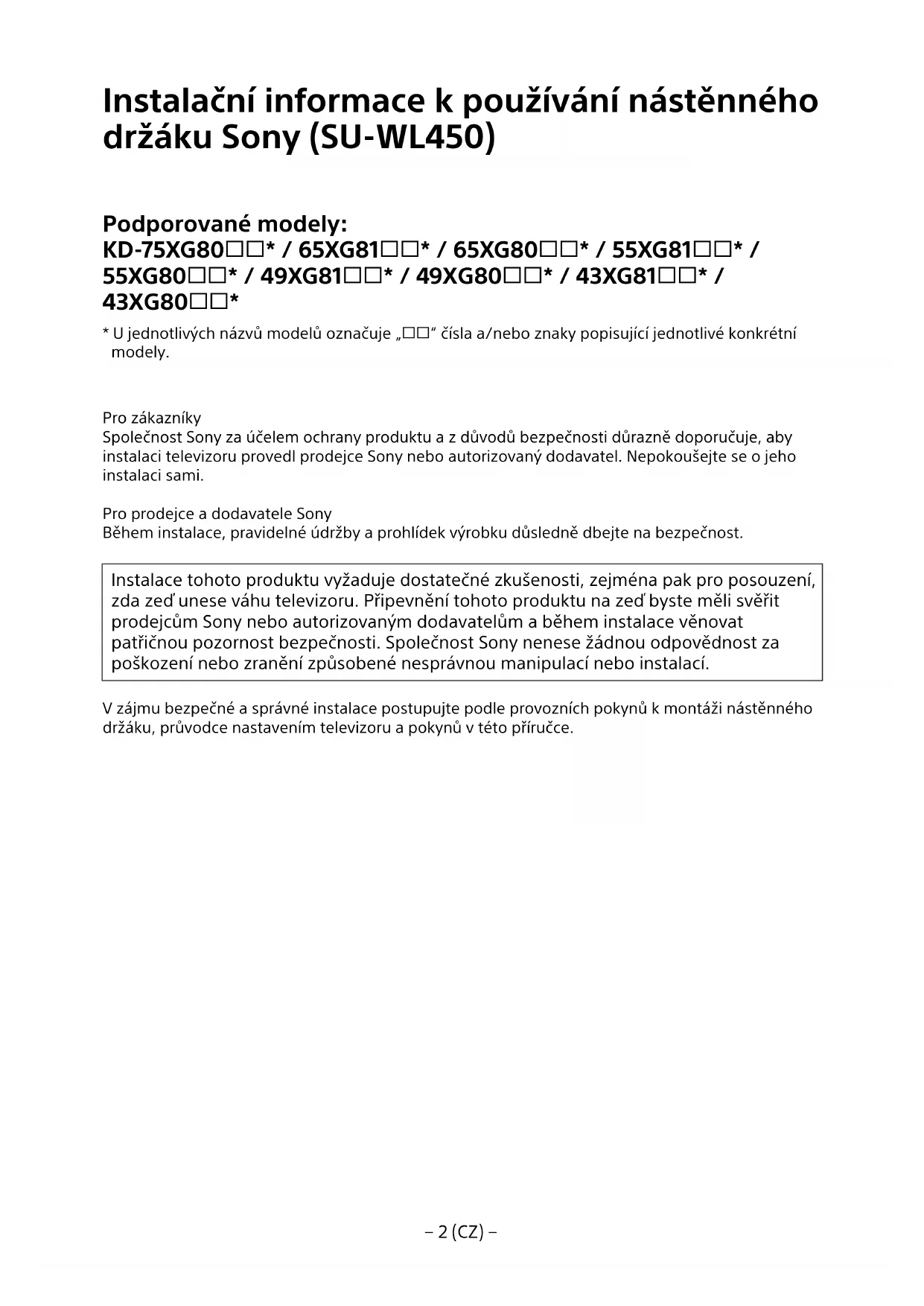 - U jednotlivých názvů modelů označuje „“ čísla a/nebo znaky popisující jednotlivé konkrétní modely. Pro zákazníky Společnost Sony za účelem ochrany produktu a z důvodů bezpečnosti důrazně doporučuje, aby instalaci televizoru provedl prodejce Sony nebo autorizovaný dodavatel. Nepokoušejte se o jeho instalaci sami. Pro prodejce a dodavatele Sony Během instalace, pravidelné údržby a prohlídek výrobku důsledně dbejte na bezpečnost. Instalace tohoto produktu vyžaduje dostatečné zkušenosti, zejména pak pro posouzení, zda zeď unese váhu televizoru. Připevnění tohoto produktu na zeď byste měli svěřit prodejcům Sony nebo autorizovaným dodavatelům a během instalace věnovat patřičnou pozornost bezpečnosti. Společnost Sony nenese žádnou odpovědnost za poškození nebo zranění způsobené nesprávnou manipulací nebo instalací. V zájmu bezpečné a správné instalace postupujte podle provozních pokynů k montáži nástěnného držáku, průvodce nastavením televizoru a pokynů v této příručce.− 3 (CZ) −
