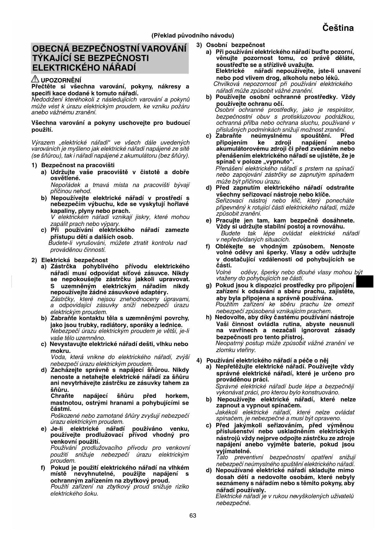 UPOZORNĚNÍ Přečtěte si všechna varování, pokyny, nákresy a specifi kace dodané k tomuto nářadí. Nedodržení kteréhokoli z následujících varování a pokynů může vést k úrazu elektrickým proudem, ke vzniku požáru anebo vážnému zranění. Všechna varování a pokyny uschovejte pro budoucí použití. Výrazem „elektrické nářadí“ ve všech dále uvedených varováních je myšleno jak elektrické nářadí napájené ze sítě (se šňůrou), tak i nářadí napájené z akumulátoru (bez šňůry).