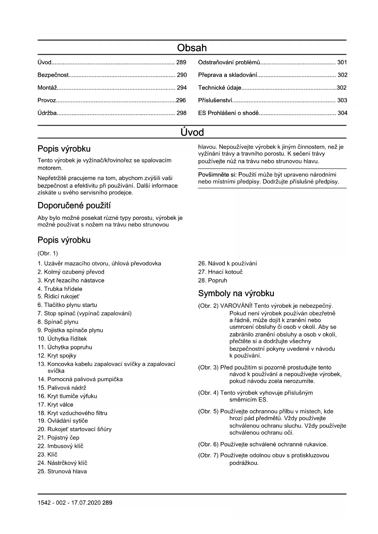 - ES Prohlášení o shodě Úvod Popis výrobku Tento výrobek je vyžínač/křovinořez se spalovacím motorem. Nepřetržitě pracujeme na tom, abychom zvýšili vaši bezpečnost a efektivitu při používání. Další informace získáte u svého servisního prodejce. Doporučené použití Aby bylo možné posekat různé typy porostu, výrobek je možné používat s nožem na trávu nebo strunovou hlavou. Nepoužívejte výrobek k jiným činnostem, než je vyžínání trávy a travního porostu. K sečení trávy používejte nůž na trávu nebo strunovou hlavu. Povšimněte si: Použití může být upraveno národními nebo místními předpisy. Dodržujte příslušné předpisy. Popis výrobku (Obr. 1) p. 304