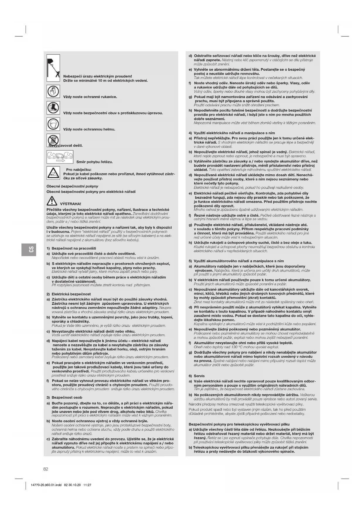 Směr pohybu řetězu. Pro nabíječku: Pokud je kabel poškozen nebo proříznut, ihned vytáhnout zástr- čku ze síťové zásuvky. Obecné bezpečnostní pokyny Obecné bezpečnostní pokyny pro elektrické nářadí VÝSTRAHA! Přečtěte všechny bezpečnostní pokyny, nařízení, ilustrace a technické údaje, kterými je toto elektrické nářadí opatřeno. Zanedbání dodržování bezpečnostních pokynů a nařízení může mít za následek úraz elektrickým prou- dem, požár a / nebo těžká zranění. Uložte všechny bezpečnostní pokyny a nařízení tak, aby byly k dispozici i v budoucnu. Pojem “elektrické nářadí” použitý v bezpečnostních pokynech se vztahuje na elektrické nářadí napájené ze sítě (se síťovým kabelem) a na elek- trické nářadí napájené z akumulátoru (bez síťového kabelu).