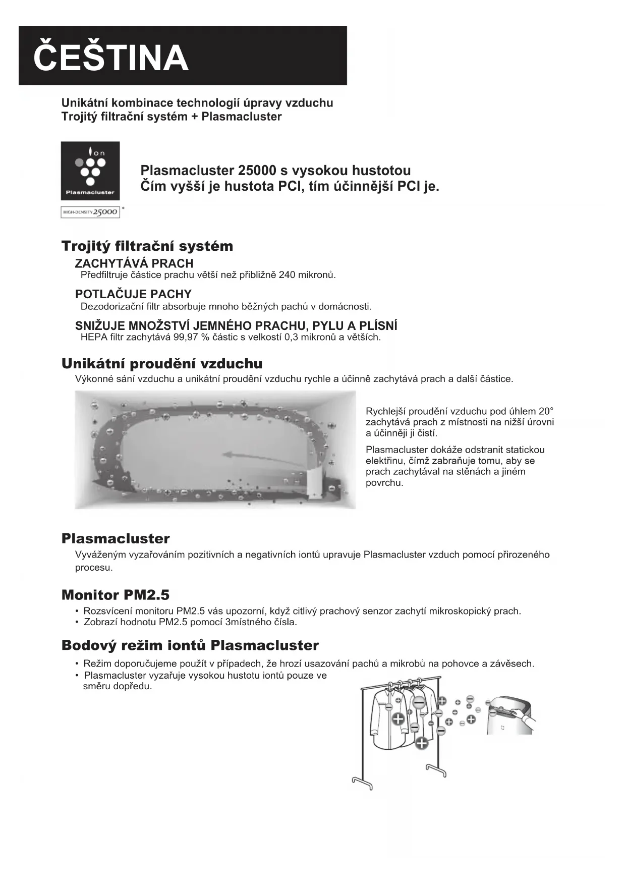 Rychlejší proudění vzduchu pod úhlem 20° zachytává prach z místnosti na nižší úrovni a účinněji ji čistí. Plasmacluster dokáže odstranit statickou elektřinu, čímž zabraňuje tomu, aby se prach zachytával na stěnách a jiném povrchu.