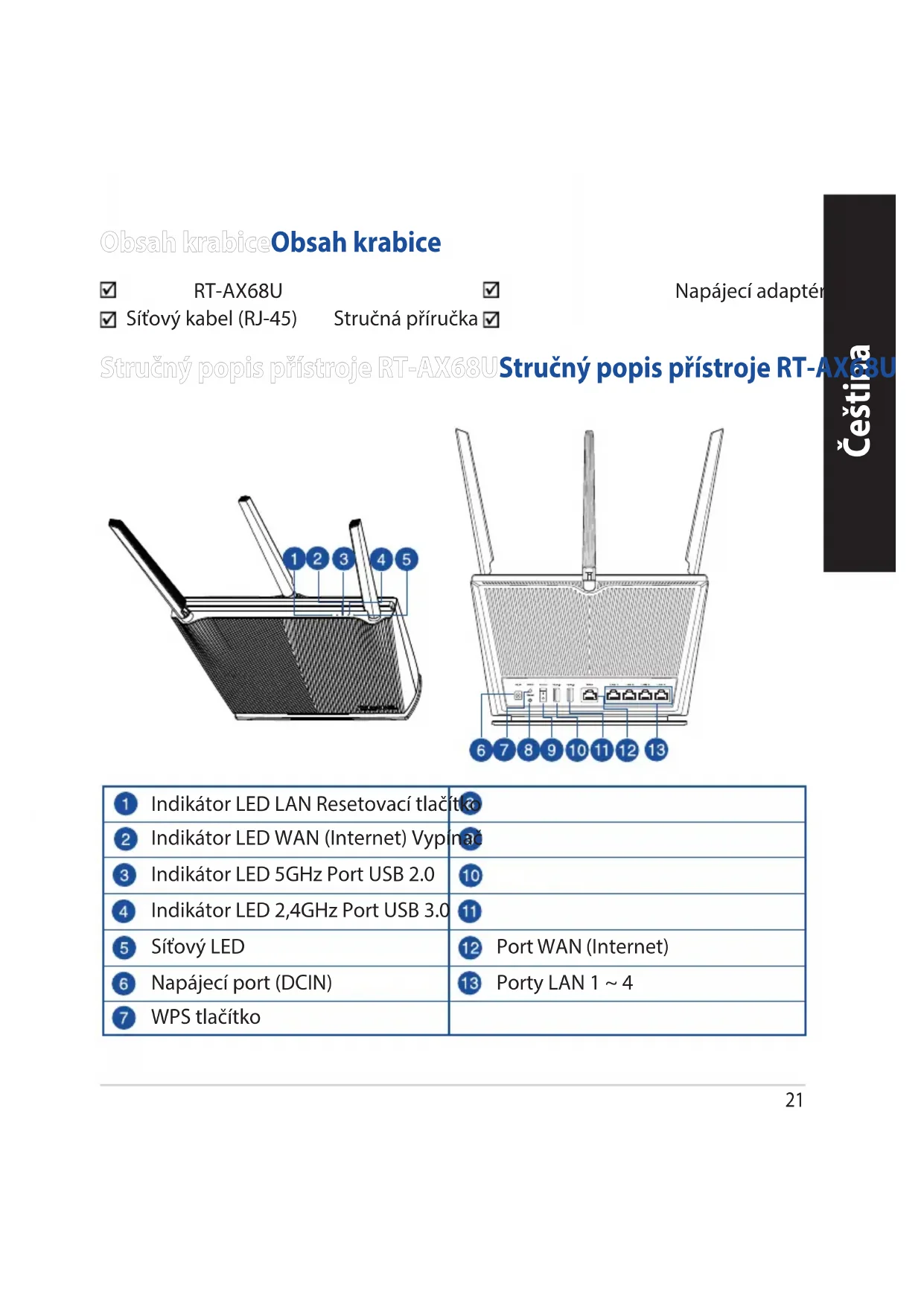 Stručný popis přístroje RT-AX68UStručný popis přístroje RT-AX68U Obsah krabiceObsah krabice RT-AX68U Napájecí adaptér Síťový kabel (RJ-45) Stručná příručka Čeština Indikátor LED LAN Resetovací tlačítko Indikátor LED WAN (Internet) Vypínač Indikátor LED 5GHz Port USB 2.0 Indikátor LED 2,4GHz Port USB 3.0 Síťový LED Port WAN (Internet) Napájecí port (DCIN) Porty LAN 1 ~ 4 WPS tlačítkoČeština
