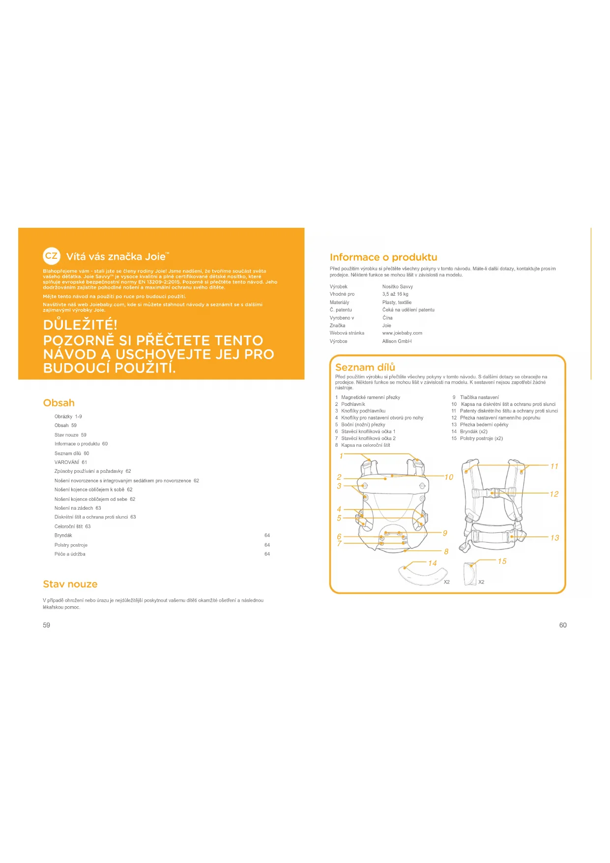 BUDOUCÍ POUŽITÍ. Obsah Obrázky 1-9Obsah 59Stav nouze 59Informace o produktu 60Seznam dílů 60VAROVÁNÍ 61Způsoby používání a požadavky 62Nošení novorozence s integrovaným sedátkem pro novorozence 62Nošení kojence obličejem k sobě 62Nošení kojence obličejem od sebe 62Nošení na zádech 63Diskrétní štít a ochrana proti slunci 63Celoroční štít 63Bryndák 64Polstry postroje 64Péče a údržba 64 Stav nouze V případě ohrožení nebo úrazu je nejdůležitější poskytnout vašemu dítěti okamžité ošetření a následnou lékařskou pomoc. Seznam dílů Před použitím výrobku si přečtěte všechny pokyny v tomto návodu. S dalšími dotazy se obracejte na prodejce. Některé funkce se mohou lišit v závislosti na modelu. K sestavení nejsou zapotřebí žádné nástroje. 1 Magnetické ramenní přezky 2 Podhlavník 3 Knoflíky podhlavníku 4 Knoflíky pro nastavení otvorů pro nohy 5 Boční (nožní) přezky 6 Stavěcí knoflíková očka 1 7 Stavěcí knoflíková očka 2 8 Kapsa na celoroční štít 9 Tlačítka nastavení10 Kapsa na diskrétní štít a ochranu proti slunci 11 Patenty diskrétního štítu a ochrany proti slunci 12 Přezka nastavení ramenního popruhu13 Přezka bederní opěrky14 Bryndák (x2)15 Polstry postroje (x2)