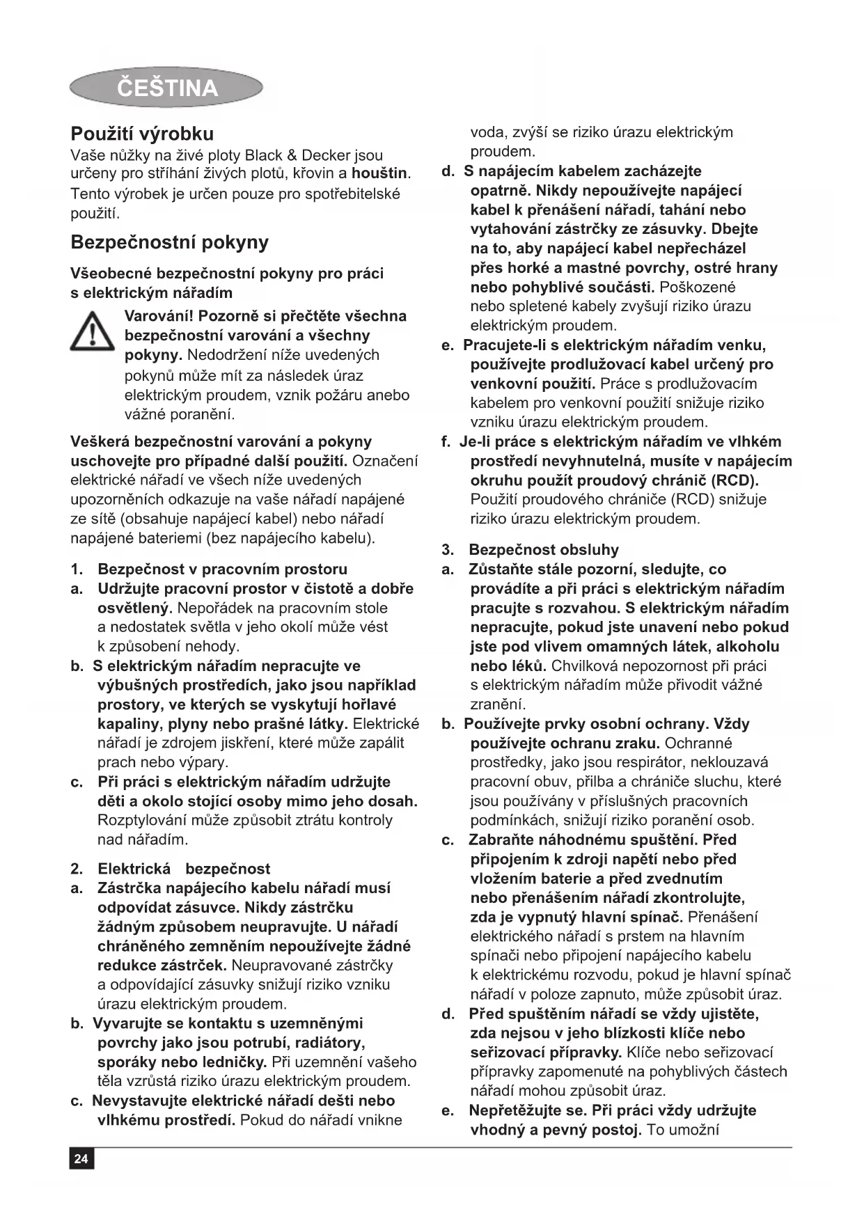 a. Svěřte opravu vašeho elektrického nářadí pouze osobě s příslušnou kvalifi kací, která bude používat výhradně originální náhradní díly. Tím zajistíte bezpečný provoz nářadí. Doplňkové bezpečnostní pokyny pro práci s elektrickým nářadím Varování! Doplňkové bezpečnostní pokyny pro nůžky na živé ploty ♦ Udržujte všechny části těla v bezpečné vzdálenosti od ostří nůžek. Pohybují-li se nože nůžek, neodstraňujte ostříhaný materiál a nedržte materiál, který budete stříhat. Při odstraňování materiálu, který blokuje nože nůžek, se ujistěte, zda je vypnutý hlavní spínač. Chvilková nepozornost při obsluze tohoto nářadí může způsobit vážné zranění. ♦ Přenášejte nůžky na živé ploty za rukojeť a dbejte na to, aby byly nože nůžek zastaveny. Při přepravě nebo skladování nasaďte na lištu nůžek příslušný kryt. Správná manipulace s nůžkami na živé ploty snižuje riziko zranění, které mohou způsobit nože nůžek. ♦ Dbejte na to, aby se napájecí kabel nedostal do blízkosti pracovního prostoru nožů. Během práce může být napájecí kabel zakrytý porostem a může dojít k jeho náhodnému přestřižení. ♦ Toto nářadí není určeno k použití osobami (včetně dětí) se sníženými fyzickými, smyslovými nebo duševními schopnostmi, nebo s nedostatkem zkušeností a znalostí, pokud těmto osobám nebyl stanoven dohled, nebo pokud jim nebyly poskytnuty instrukce týkající se použití nářadí osobou odpovědnou za jejich bezpečnost. Děti by měly být pod dozorem, aby bylo zajištěno, že si s nářadím nebudou hrát. ♦ V tomto návodu je popsáno správné použití nářadí. Použití jakéhokoli jiného příslušenství nebo přídavných zařízení, nebo jakékoli jiné využití tohoto nářadí, než je popsáno v tomto návodu k použití, může mít za následek poranění osob nebo způsobení hmotných škod.26 ČEŠTINA ♦ Nepřenášejte nářadí s rukama na přední rukojeti, na spínači nebo na spouštěcím spínači, pokud není vyjmuta baterie. ♦ Budete-li nůžky na živé ploty používat poprvé, mimo nastudování tohoto návodu vyhledejte zkušeného pracovníka, který vám poskytne praktické rady pro práci s nůžkami na živé ploty. ♦ Nikdy se nedotýkejte nožů, pokud je nářadí v chodu. ♦ Nikdy se nepokoušejte zastavit dobíhající nože. ♦ Nepokládejte nářadí na zem, dokud se nože zcela nezastaví. ♦ Pravidelně kontrolujte opotřebování nebo poškození nožů. Nepoužívejte toto nářadí, jsou-li poškozeny jeho nože. ♦ Při stříhání zabraňte kontaktu nožů s tvrdými předměty (např. kovová vedení, ploty, zábradlí). Pokud k takovému kontaktu dojde, nářadí ihned vypněte a zkontrolujte, zda nedošlo k jeho poškození. ♦ Začne-li nářadí nadměrně vibrovat, ihned jej vypněte a zkontrolujte, zda nedošlo k jeho poškození. ♦ Dojde-li k zaseknutí nářadí, ihned vypněte hlavní spínač. Dříve než budete odstraňovat jakýkoli předmět, vyjměte z nářadí baterii. ♦ Po skončení práce nasaďte na lištu nůžek ochranné pouzdro. Při ukládání nářadí zkontrolujte, zda nejsou nože obnaženy. ♦ Při práci s nářadím zkontrolujte, zda jsou řádně připevněny všechny kryty. Nikdy nepracujte s nekompletním nebo neodborně upraveným nářadím. ♦ Nikdy nedovolte pracovat s nářadím dětem. ♦ Pozor na padající úlomky při práci ve vyšších částech živého plotu. ♦ Nářadí vždy držte za rukojeti oběma rukama. Bezpečnost ostatních osob ♦ Toto nářadí není určeno pro použití osobami (včetně dětí) se sníženými fyzickými, smyslovými nebo duševními schopnostmi, nebo s nedostatkem zkušeností a znalostí, pokud těmto osobám nebyl stanoven dohled, nebo pokud jim nebyly poskytnuty instrukce týkající se použití výrobku osobou odpovědnou za jejich bezpečnost. ♦ Děti by měly být pod dozorem, aby si s nářadím nehrály. Vibrace Deklarovaná úroveň vibrací uvedená v technických údajích a v prohlášení o shod ě byla měřena v souladu se standardní zkušební metodou předepsanou normou EN 60745 a může být použita pro srovnání jednotlivých nářadí mezi sebou. Deklarovaná úroveň vibrací může být také použita k předběžnému stanovení doby práce s tímto výrobkem. Varování! Úroveň vibrací při aktuálním použití elektrického nářadí se může od deklarované úrovně vibrací lišit v závislosti na způsobu použití výrobku. Úroveň vibrací může být vzhledem k uvedené hodnotě vyšší. Při stanovení doby vystavení se působení vibrací, z důvodu určení bezpečnostních opatření podle normy 2002/44/EC k ochraně osob pravidelně používajících elektrické nářadí v zaměstnání, by měl předběžný odhad působení vibrací brát na zřetel aktuální podmínky použití nářadí s přihlédnutím na všechny části pracovního cyklu, jako jsou doby, při které je nářadí vypnuto a kdy běží naprázdno. Nálepky na nářadí Na nářadí jsou následující piktogramy: Varování! Z důvodu snížení rizika způsobení úrazu si uživatel musí přečíst tento návod k obsluze. Vždy používejte ochranné brýle a vhodnou ochranu sluchu. Při práci s tímto nářadím používejte pracovní rukavice. Pokud je napájecí kabel poškozen nebo přetržen, okamžitě jej vytáhněte ze zásuvky. Nevystavujte nářadí dešti nebo vlhkosti. Elektrická bezpečnost Toto nářadí je opatřeno dvojitou izolací. Z tohoto důvodu není nutná ochrana uzemněním. Vždy zkontrolujte, zda napětí v síti odpovídá napětí na výkonovém štítku. ♦ Poškozený napájecí kabel musí být vyměněn výrobcem nebo v autorizovaném servisu Black & Decker, aby nedošlo k úrazu elektrickým proudem.27 ČEŠTI