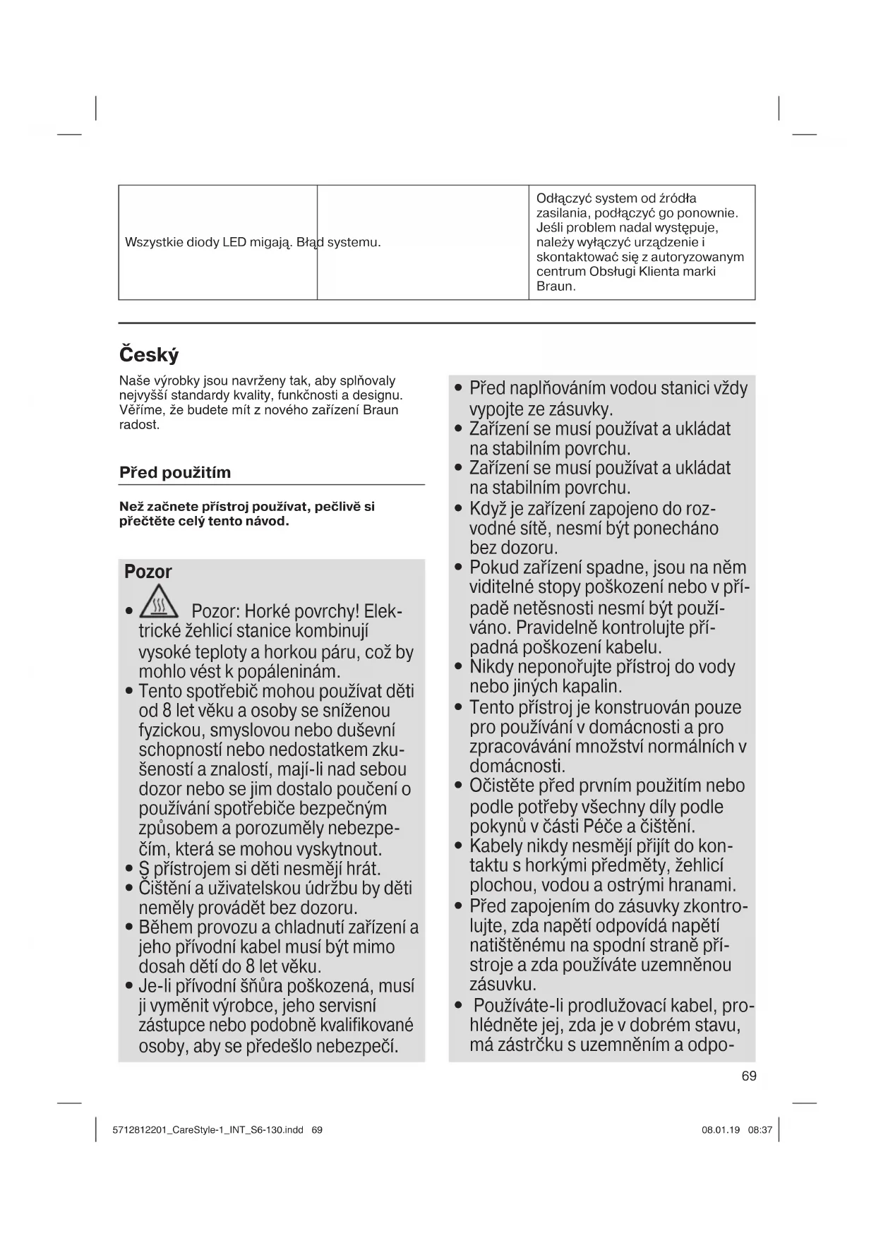 Varování: Vzhledem k vysokému výkonu tohoto přístroje se, prosím, ujistěte, že máte odpovídající zdroj elektrického proudu. Informujte se u své elektrárenské společnosti, zda celkový odpor hlavního rozvodu nepřekračuje hodnotu 0.372 Ohmu. 5712812201_CareStyle-1_INT_S6-130.indd 705712812201_CareStyle-1_INT_S6-130.indd 70 08.01.19 08:3708.01.19 08:3771