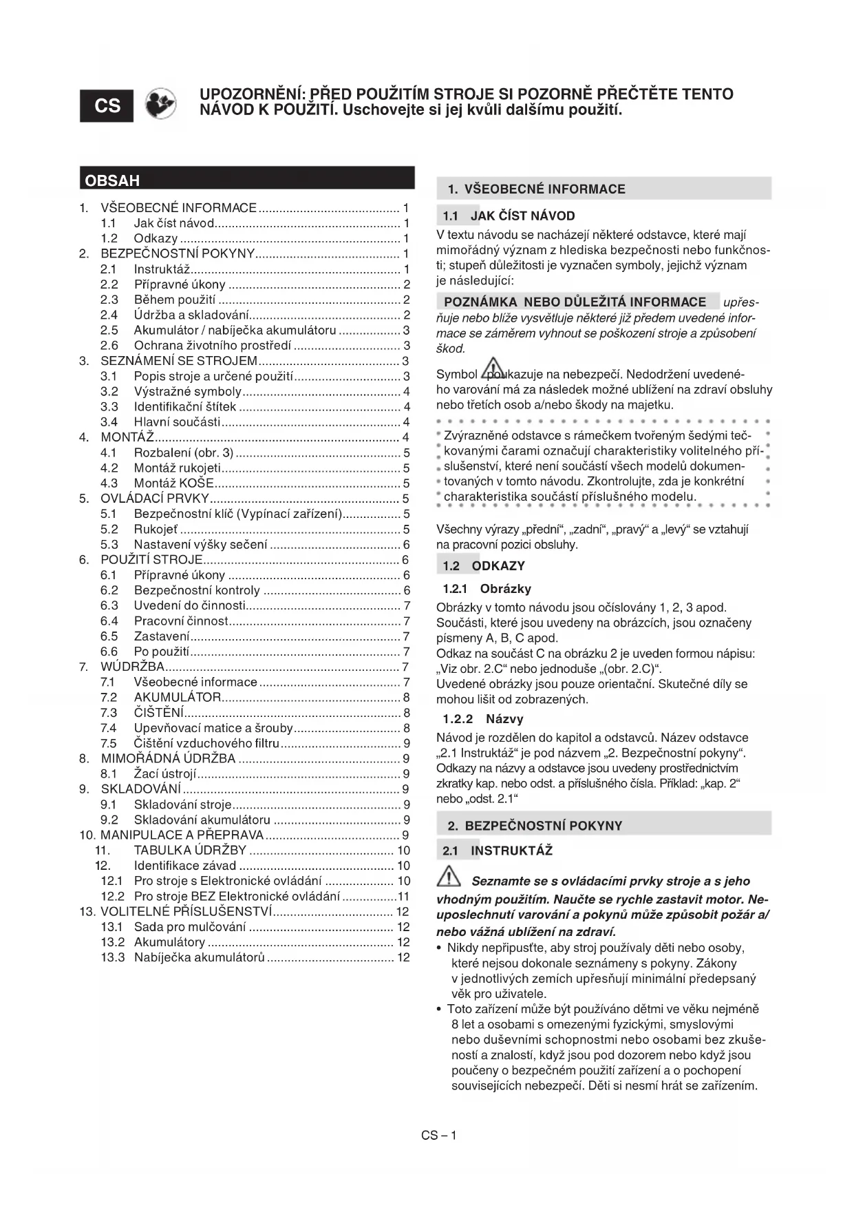 vydá zvukový signál. Akumulátor není správně vložený. Otevřete dvířka a ujistěte se, že je akumulátor správně umístěn (odst. 7.2.3). Vybitý akumulátor. Zkontrolujte stav nabití akumulátoru a dle po- třeby jej dobijte (odst. 7.2.2). Zásah tepelné ochrany následkem pře- hřátí motoru. Vyčkejte 5 minut a poté znovu uveďte stroj do činnosti. Zablokované žací ústrojí. Zastavte stroj, vyjměte bezpečnostní klíč, nasaďte si pracovní rukavice. Zkontrolujte a odstraňte případné překážky ve spodní části stroje (odst. 7.3.2) zabraňující otáčení žacího ústrojí. Jestliže problém přetrvává, pro ověření, vý- měny a opravy kontaktujte servisní středisko (odst. 8.1). Porucha stroje Vyjměte bezpečnostní klíč a kontaktujte servis- ní středisko pro kontroly, výměny nebo opravy.CS – 12