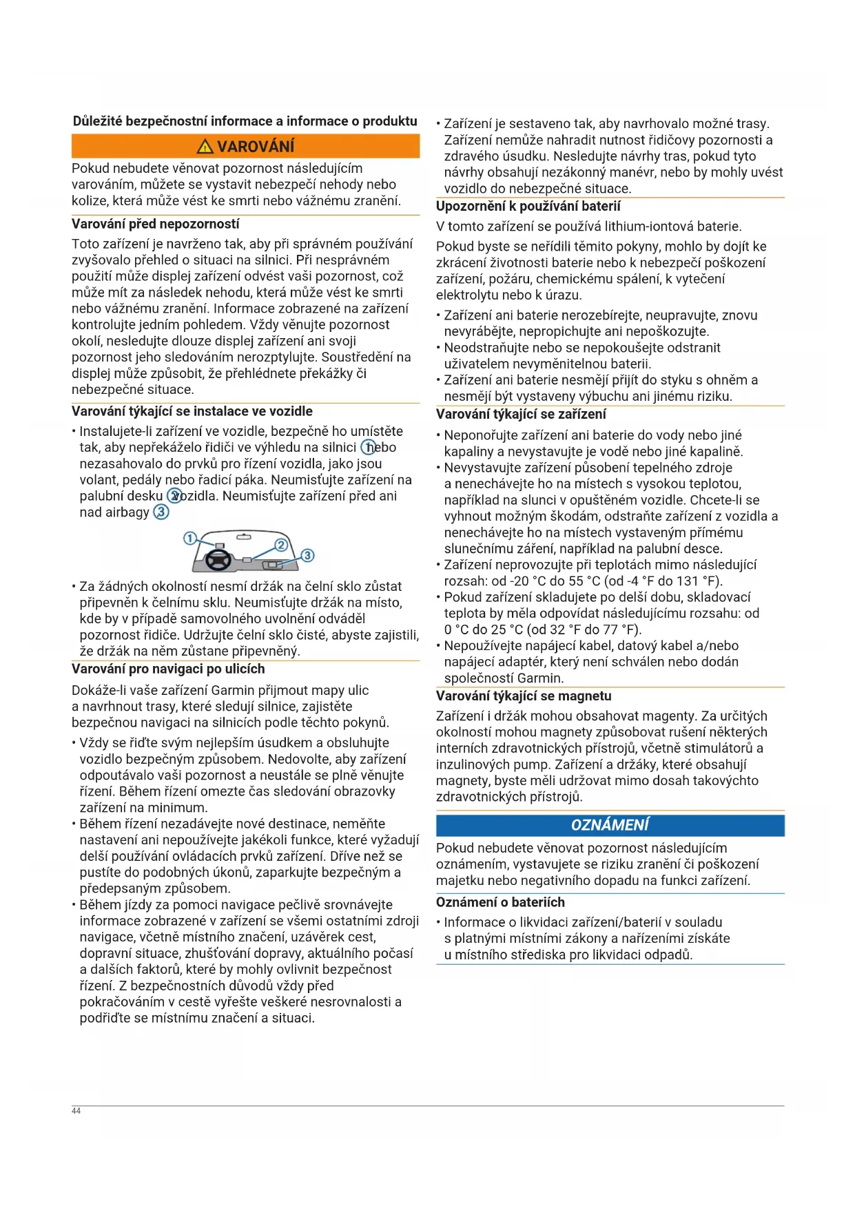 - Za žádných okolností nesmí držák na čelní sklo zůstat připevněn k čelnímu sklu. Neumisťujte držák na místo, kde by v případě samovolného uvolnění odváděl pozornost řidiče. Udržujte čelní sklo čisté, abyste zajistili, že držák na něm zůstane připevněný. Varování pro navigaci po ulicích Dokáže-li vaše zařízení Garmin přijmout mapy ulic a navrhnout trasy, které sledují silnice, zajistěte bezpečnou navigaci na silnicích podle těchto pokynů.