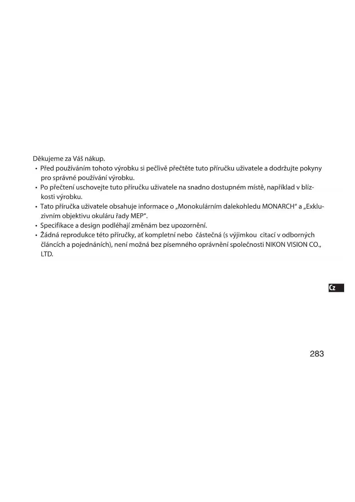 - Žádná reprodukce této příručky, ať kompletní nebo částečná (s výjimkou citací v odborných článcích a pojednáních), není možná bez písemného oprávnění společnosti NIKON VISION CO., LTD.284