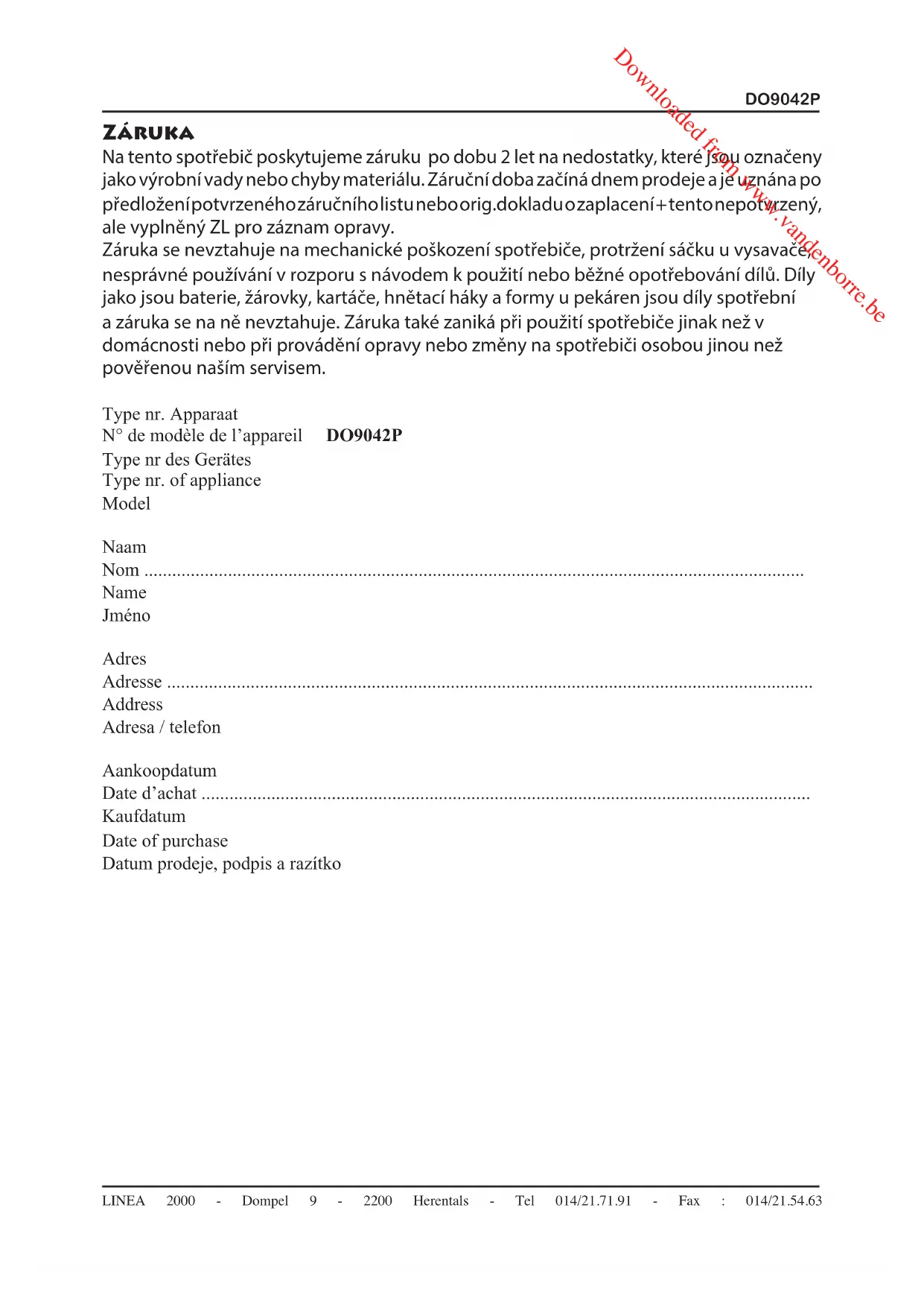 Downloaded from www.vandenborre.beDO9042P REKLAMACE : (VYPLNÍ ZÁKAZNÍK NEBO OBCHOD) Popis vady 1. reklamace Popis vady 2. reklamace Popis vady 3. reklamace Záznamy servisu : 1.reklamace (datum přijetí/odeslání/ číslo reklamačního dokladu) 2.reklamace (datum přijetí/odeslání/ číslo reklamačního dokladu) 3.reklamace (datum přijetí/odeslání/ číslo reklamačního dokladu)