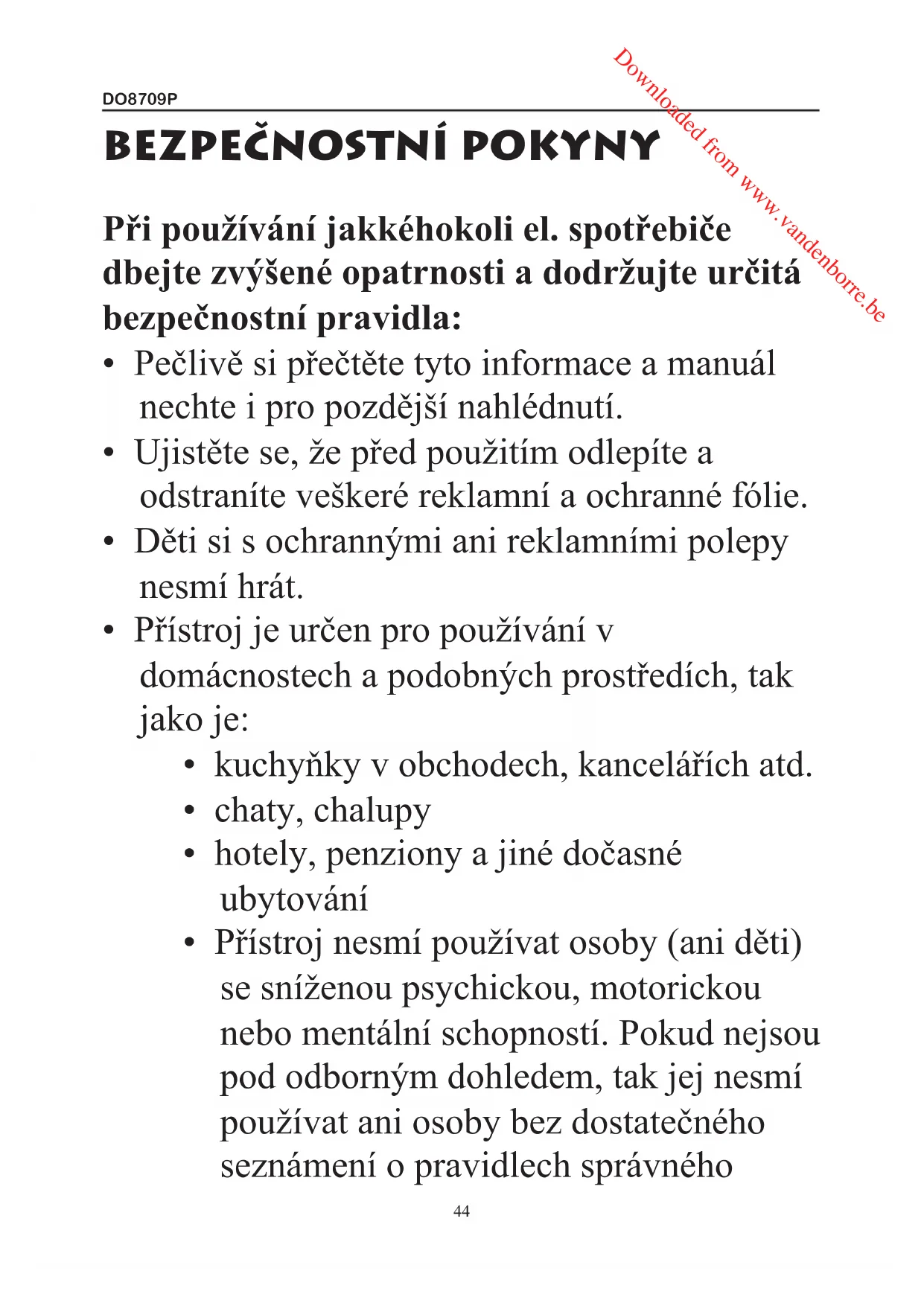 - Přístroj nesmí používat osoby (ani děti) se sníženou psychickou, motorickou nebo mentální schopností. Pokud nejsou pod odborným dohledem, tak jej nesmí používat ani osoby bez dostatečného seznámení o pravidlech správného Downloaded from www.vandenborre.beDO8709P www.domo-elektro.be
