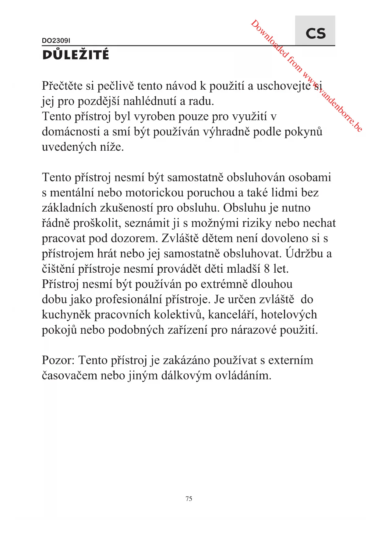 Symbol na přístroji či na jeho obalu znamená, že s tímto výrobkem není možno nakládat jako s běžným domovním odpadem, nýbrž musí být odevzdán na místech určených ke sběru a likvidaci elektrických a elektronických zařízení. Dodržením tohoto doporučení chráníte životní prostředí a zdraví spoluobčanů. Více informací o možnostech likvidace nebezpečného odpadu obdržíte na obecních nebo městských úřadech, sběrných dvorech nebo v prodejně, kde jste přístroj zakoupili. Obalové materiály jsou recyklovatelné, nakládejte s nimi podle předpisů pro životní prostředí. Downloaded from www.vandenborre.beDO2309I