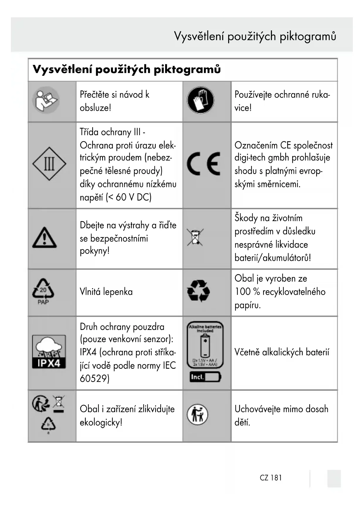Obsah 180 CZVysvětlení použitých piktogramů Přečtěte si návod k obsluze! Používejte ochranné ruka vice! Třída ochrany III - Ochrana proti úrazu elek trickým proudem (nebez pečné tělesné proudy) díky ochrannému nízkému napětí (< 60 V DC) Označením CE společnost digi-tech gmbh prohlašuje shodu s platnými evrop skými směrnicemi. Dbejte na výstrahy a řiďte se bezpečnostními pokyny! Einleitung / Sicherheit Škody na životním prostředím v důsledku nesprávné likvidace baterií/akumulátorů! Vlnitá lepenka Obal je vyroben ze 100 % recyklovatelného papíru. Druh ochrany pouzdra (pouze venkovní senzor): IPX4 (ochrana proti stříka jící vodě podle normy IEC 60529) Včetně alkalických baterií Obal i zařízení zlikvidujte ekologicky! Uchovávejte mimo dosah dětí. CZ 181 Vysvětlení použitých piktogramůNevhazujte do ohně! Nevkládejte nesprávným směrem, respektujte pola ritu (+/-)! Nepoužívejte sílu! Nerozebírejte/neoteví rejte! Nepoužívejte současně různé systémy, značky a typy! Nikdy nemíchejte nové a použité baterie! Nedobíjejte! Nevhazujte do vody! Nezkratujte! – Baterie mohou vybuchnout nebo přestat těsnit. Vložte správně – respek tujte polaritu (+/-)! ● Úvod Srdečně Vám blahopřejeme k zakoupení Vašeho nového přístroje. Rozhodli jste se pro vysoce kvalitní výrobek. Součástí tohoto výrobku je návod k obsluze. Obsahuje důležité pokyny k bezpečnosti, použití a likvi daci. Před použitím výrobku se seznamte se všemi pokyny k obsluze a s bezpeč nostními pokyny. Výrobek používejte pouze tak, jak je popsáno, a pouze pro stanovené oblasti použití. V případě předání výrobku třetí osobě předejte také veškerou dokumentaci. Tento dokument je kompletním návodem k obsluze. Naskenováním QR kódu se dostanete přímo na stránky servisu Lidl (www.lidl-service.com). Při zadání čísla výrobku IAN 466444_2404 si můžete přečíst a stáhnout tento návod k obsluze. 182 CZ Vysvětlení použitých piktogramů / Úvod● Použití ke stanovenému účelu Tento výrobek je určen pro záznam a zobrazení parametrů prostředí v interiéru i exteriéru a také pro bezdrátové zobrazení hodin a data. Jedná se o výrobek s informačními technologiemi. Bezdrátová meteostanice je určena pouze pro používání v interiéru. Venkovní senzor je určen pro vnitřní i venkovní použití. Výrobek je určen pouze pro soukromé použití. Není určen pro průmyslové použí vání. Pokyny ke značce zboží