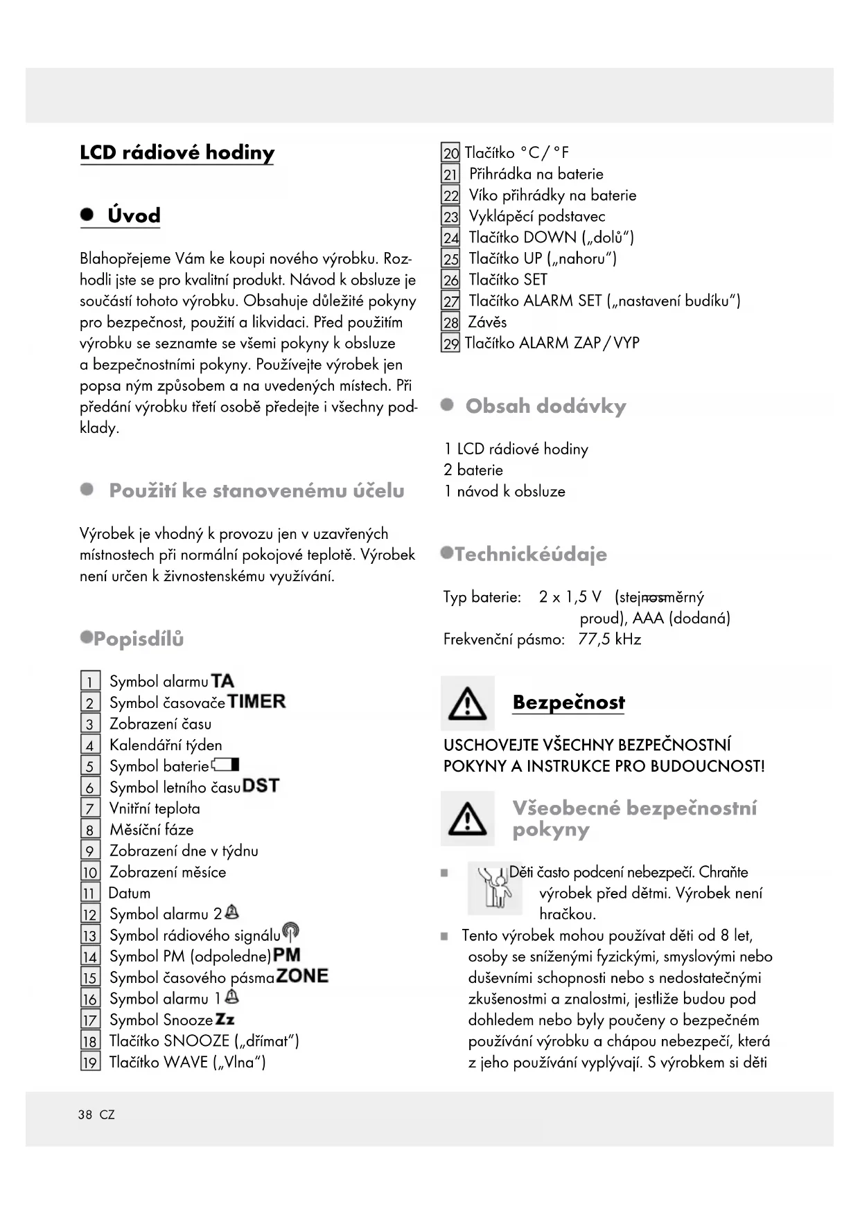 Tlačítko ALARM ZAP / VYP Obsah dodávky 1 LCD rádiové hodiny 2 baterie 1 návod kobsluze Technické údaje Typ baterie: 2 x 1,5 V (stejnosměrný proud), AAA (dodaná) Frekvenční pásmo: 77,5 kHz Bezpečnost