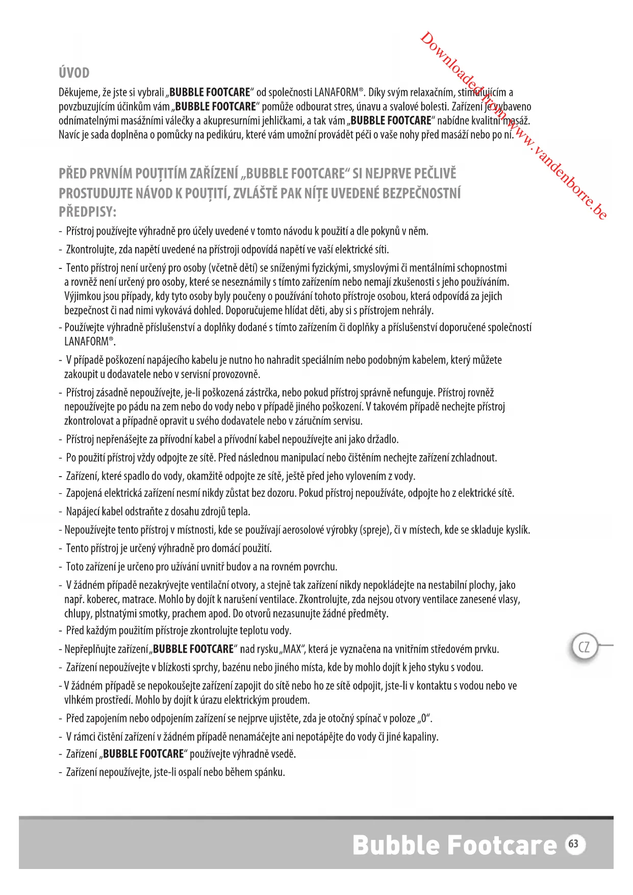 Downloaded from www.vandenborre.beCZ ÚVOD Děkujeme, že jste si vybrali „BUBBLE FOOTCARE“ od společnosti LANAFORM®. Díky svým relaxačním, stimulujícím a povzbuzujícím účinkům vám „BUBBLE FOOTCARE“ pomůže odbourat stres, únavu a svalové bolesti. Zařízení je vybaveno odnímatelnými masážními válečky a akupresurními jehličkami, a tak vám „BUBBLE FOOTCARE“ nabídne kvalitní masáž. Navíc je sada doplněna o pomůcky na pedikúru, které vám umožní provádět péči o vaše nohy před masáží nebo po ní. PŘED PRVNÍM POUŢITÍM ZAŘÍZENÍ „BUBBLE FOOTCARE“ SI NEJPRVE PEČLIVĚ PROSTUDUJTE NÁVOD K POUŢITÍ, ZVLÁŠTĚ PAK NÍŢE UVEDENÉ BEZPEČNOSTNÍ PŘEDPISY: - Přístroj používejte výhradně pro účely uvedené v tomto návodu k použití a dle pokynů v něm. - Zkontrolujte, zda napětí uvedené na přístroji odpovídá napětí ve vaší elektrické síti. - Tento přístroj není určený pro osoby (včetně dětí) se sníženými fyzickými, smyslovými či mentálními schopnostmi a rovněž není určený pro osoby, které se neseznámily s tímto zařízením nebo nemají zkušenosti s jeho používáním. Výjimkou jsou případy, kdy tyto osoby byly poučeny o používání tohoto přístroje osobou, která odpovídá za jejich bezpečnost či nad nimi vykovává dohled. Doporučujeme hlídat děti, aby si s přístrojem nehrály. - Používejte výhradně příslušenství a doplňky dodané s tímto zařízením či doplňky a příslušenství doporučené společností LANAFORM®. - V případě poškození napájecího kabelu je nutno ho nahradit speciálním nebo podobným kabelem, který můžete zakoupit u dodavatele nebo v servisní provozovně. - Přístroj zásadně nepoužívejte, je-li poškozená zástrčka, nebo pokud přístroj správně nefunguje. Přístroj rovněž nepoužívejte po pádu na zem nebo do vody nebo v případě jiného poškození. V takovém případě nechejte přístroj zkontrolovat a případně opravit u svého dodavatele nebo v záručním servisu. - Přístroj nepřenášejte za přívodní kabel a přívodní kabel nepoužívejte ani jako držadlo. - Po použití přístroj vždy odpojte ze sítě. Před následnou manipulací nebo čištěním nechejte zařízení zchladnout. - Zařízení, které spadlo do vody, okamžitě odpojte ze sítě, ještě před jeho vylovením z vody. - Zapojená elektrická zařízení nesmí nikdy zůstat bez dozoru. Pokud přístroj nepoužíváte, odpojte ho z elektrické sítě. - Napájecí kabel odstraňte z dosahu zdrojů tepla. - Nepoužívejte tento přístroj v místnosti, kde se používají aerosolové výrobky (spreje), či v místech, kde se skladuje kyslík. - Tento přístroj je určený výhradně pro domácí použití. - Toto zařízení je určeno pro užívání uvnitř budov a na rovném povrchu. - V žádném případě nezakrývejte ventilační otvory, a stejně tak zařízení nikdy nepokládejte na nestabilní plochy, jako např. koberec, matrace. Mohlo by dojít k narušení ventilace. Zkontrolujte, zda nejsou otvory ventilace zanesené vlasy, chlupy, plstnatými smotky, prachem apod. Do otvorů nezasunujte žádné předměty. - Před každým použitím přístroje zkontrolujte teplotu vody. - Nepřeplňujte zařízení „BUBBLE FOOTCARE“ nad rysku „MAX“, která je vyznačena na vnitřním středovém prvku. - Zařízení nepoužívejte v blízkosti sprchy, bazénu nebo jiného místa, kde by mohlo dojít k jeho styku s vodou. - V žádném případě se nepokoušejte zařízení zapojit do sítě nebo ho ze sítě odpojit, jste-li v kontaktu s vodou nebo ve vlhkém prostředí. Mohlo by dojít k úrazu elektrickým proudem. - Před zapojením nebo odpojením zařízení se nejprve ujistěte, zda je otočný spínač v poloze „0“. - V rámci čistění zařízení v žádném případě nenamáčejte ani nepotápějte do vody či jiné kapaliny. - Zařízení „BUBBLE FOOTCARE“ používejte výhradně vsedě. - Zařízení nepoužívejte, jste-li ospalí nebo během spánku. Bubble Footcare