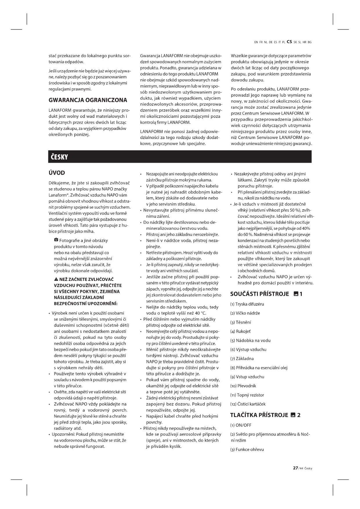 Společnost LANAFORM zaručuje, že tento výrobek k datu koupě neobsahuje vady materiálu a výrobní vady. Záruka platí dva roky, s výjimkou níže uvedených případů. Záruka společnosti LANAFORM se nevzta- huje na poškození způsobená běžným opo- třebením výrobku Dále se záruka na tento výrobek společnosti LANAFORM nevztahu- je na poškození způsobená nesprávným či nevhodným použitím, nehodou, použitím nepovoleného příslušenství, provedenými úpravami výrobku nebo jinou situací ja- kékoli povahy, kterou nemůže společnost LANAFORM ovlivnit. Společnost LANAFORM nenese odpověd- nost za vedlejší, následné či zvláštní škody. Všechny předpokládané záruky vhodnos- ti výrobku k určitému účelu se omezují na dobu dvou let od data první koupě, které musí být doložitelné kopií dokladu o koupi. Jakmile společnost LANAFORM obdrží váš přístroj, podle možností jej opraví nebo vy- mění a zašle vám jej zpět. Plnění ze záruky poskytuje pouze servisní středisko společ- nosti LANAFORM. Bude-li jakákoli oprava tohoto výrobku svěřena jiné straně než servisnímu středisku společnosti LANA- FORM, záruka pozbývá platnosti. SLOVENČINA ÚVOD Ďakujeme vám, že ste si kúpili zvlhčovač NAPO so studenou parou a horúcou parou od spoločnosti LANAFORM. Zvlhčovač NA- PO vám pomôže obnoviť správnu úroveň vlhkosti a odstrániť nepohodlie spojené so suchým vzduchom. Ventilačný systém rozptyľuje vodu vo forme studenej alebo horúcej pary a zabezpečuje požadovanú úroveň vlhkosti. Táto vodná para je viditeľná ako hmla, ktorá vychádza z dýz na difúziu.