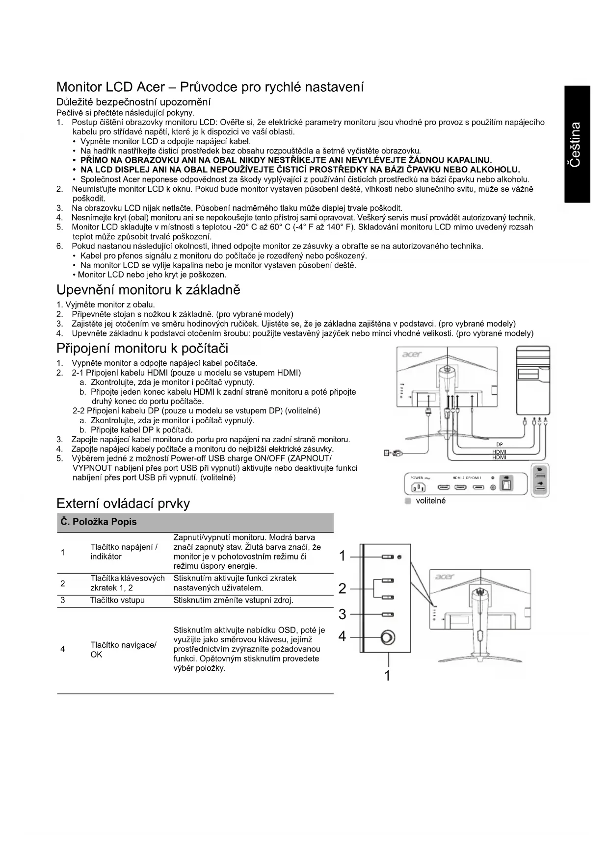 仕様は モ デルや地域に よ り 異な り ま す。Čeština Monitor LCD Acer – Průvodce pro rychlé nastavení Důležité bezpečnostní upozornění Pečlivě si přečtěte následující pokyny. 1. Postup čištění obrazovky monitoru LCD: Ověřte si, že elektrické parametry monitoru jsou vhodné pro provoz s použitím napájecího kabelu pro střídavé napětí, které je k dispozici ve vaší oblasti.
